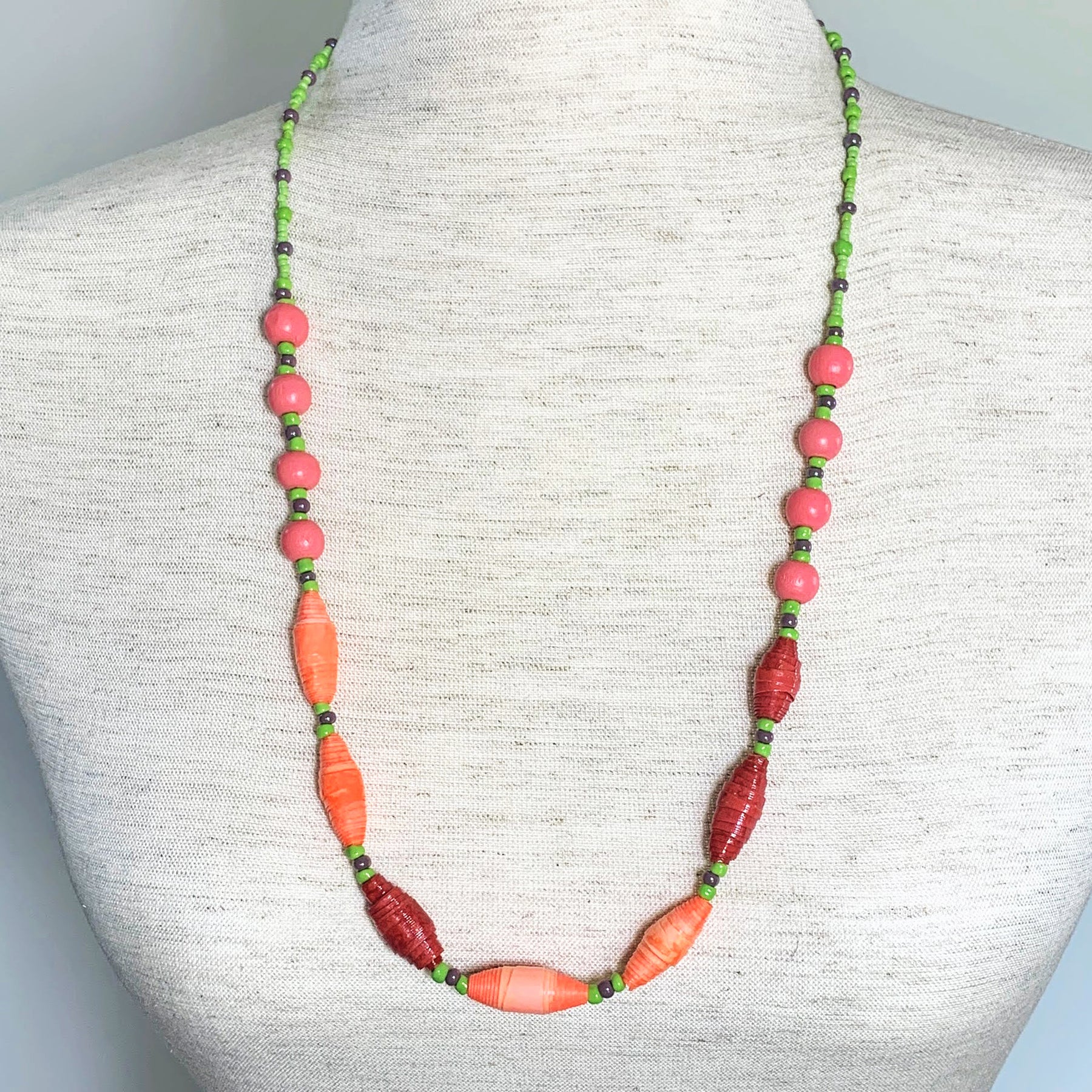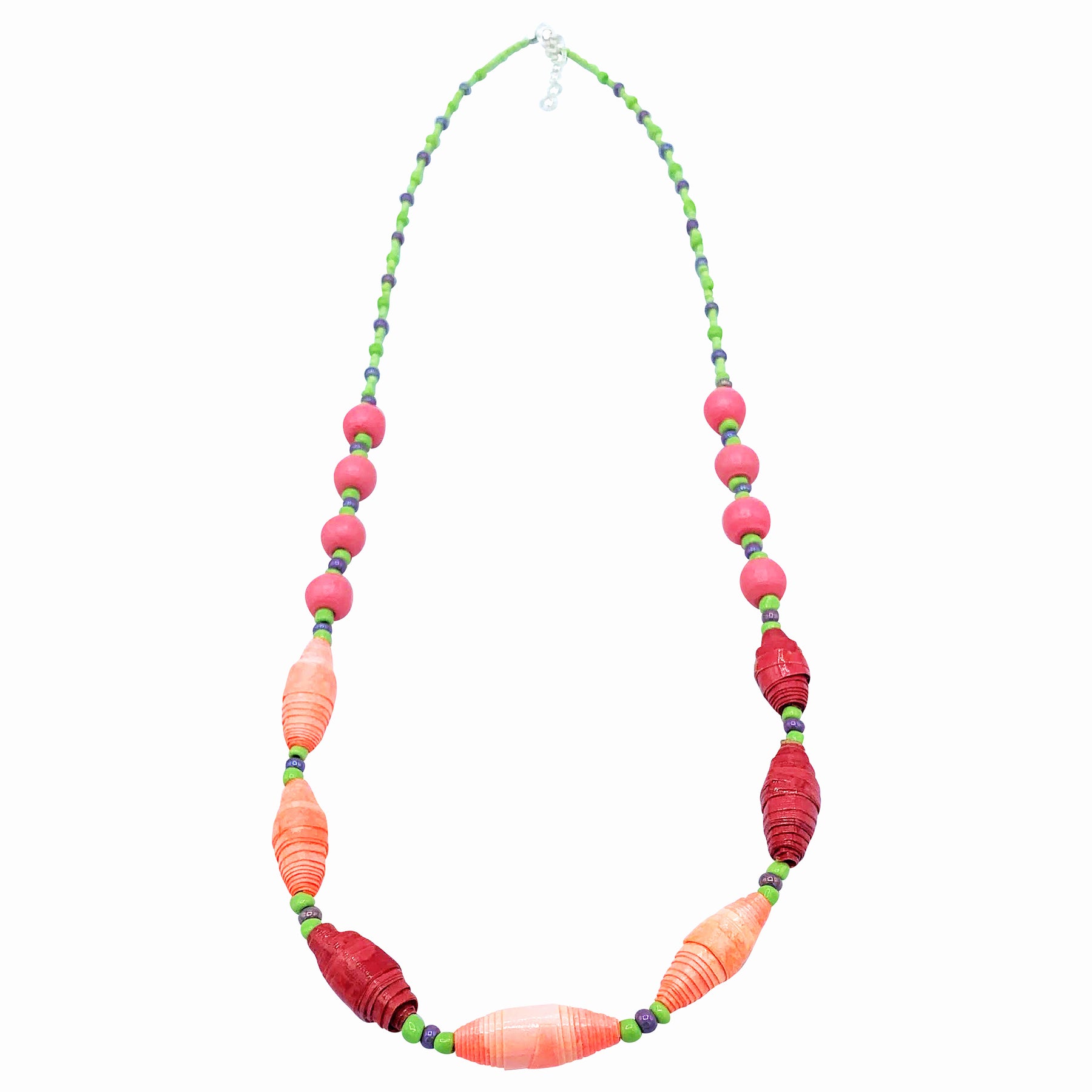 A medley of beads in a variety of colors, shapes and sizes made into a stylish accessory with a sophisticated feel. Paper beads, wood and glass beads create this lively necklace, with silver clasp and chain extension.