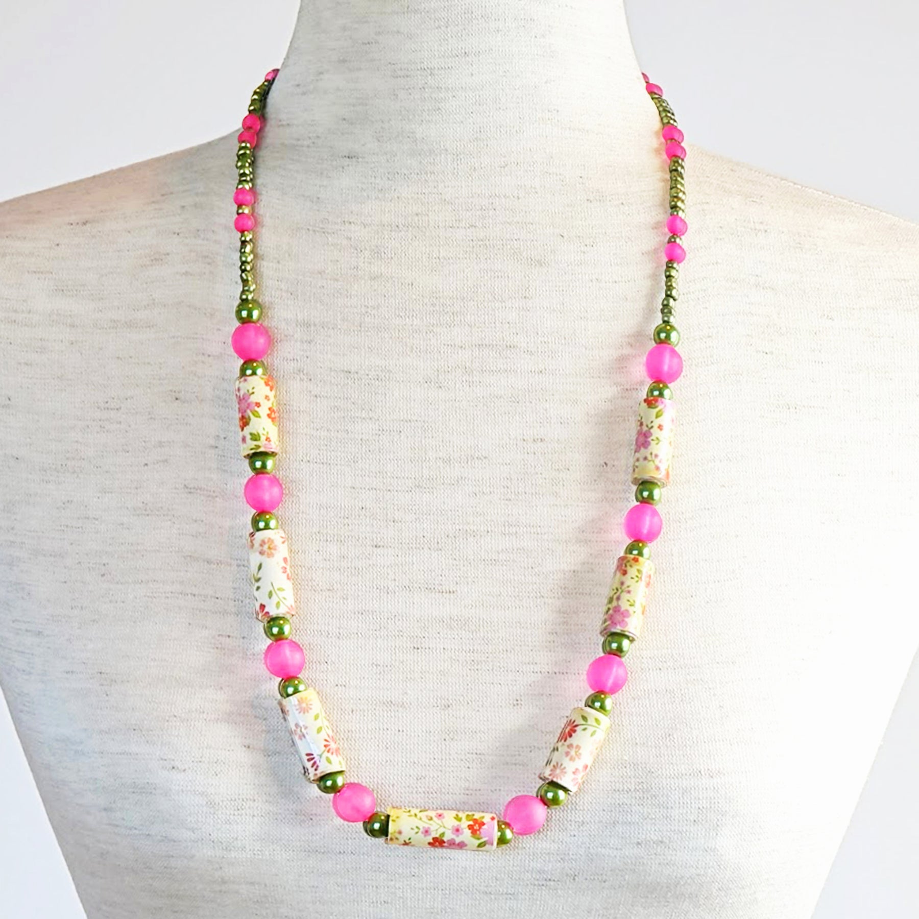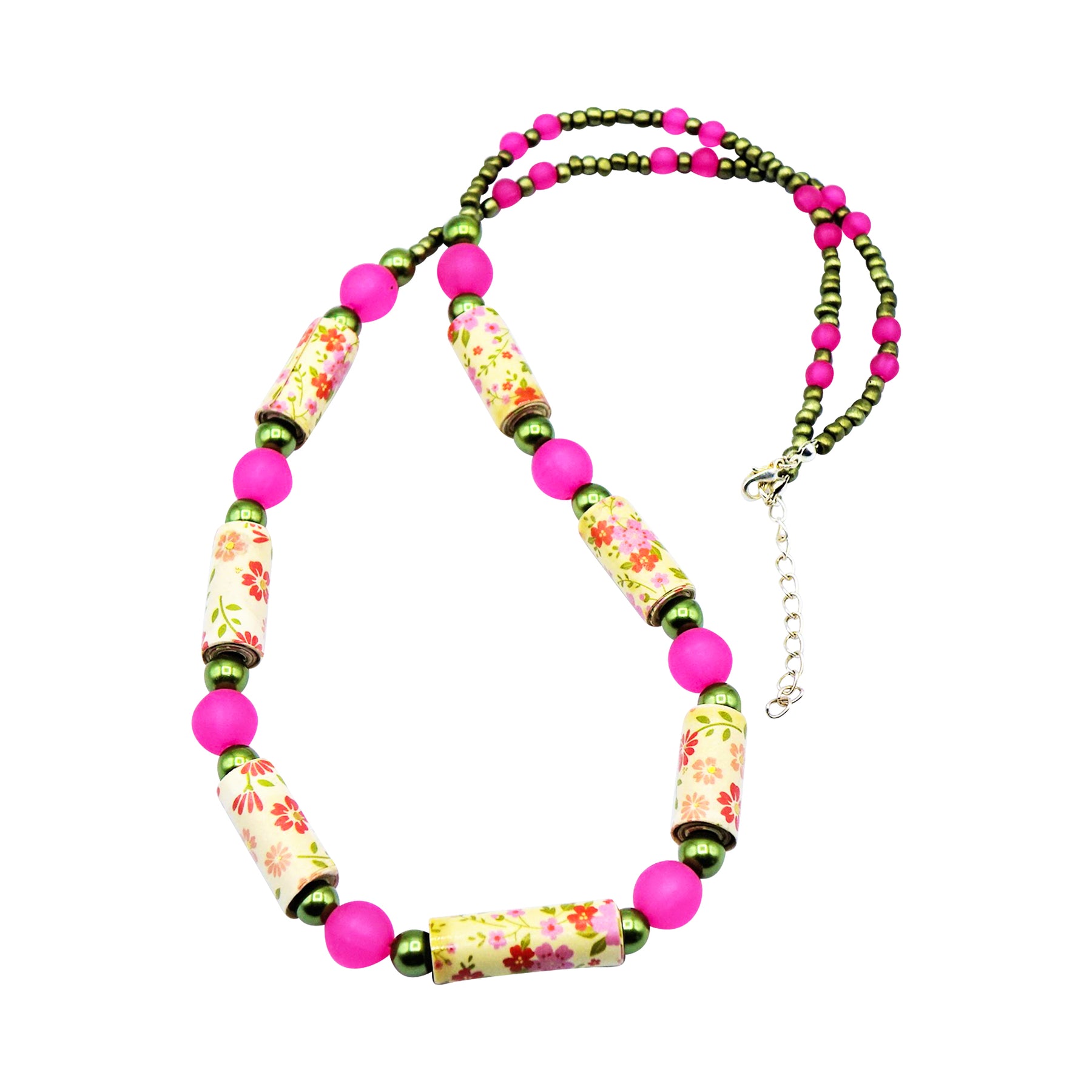 This Necklace in blue and green hues will surely make a statement on your special day! Bold and gorgeous necklace within beige and pink. I created this necklace by combining beige floral paper beads, hot pink resin beads, and glass pearls, clasp, extender. Simply great jewelry to update any outfit and make a statement! Perfect for everyday wear.
