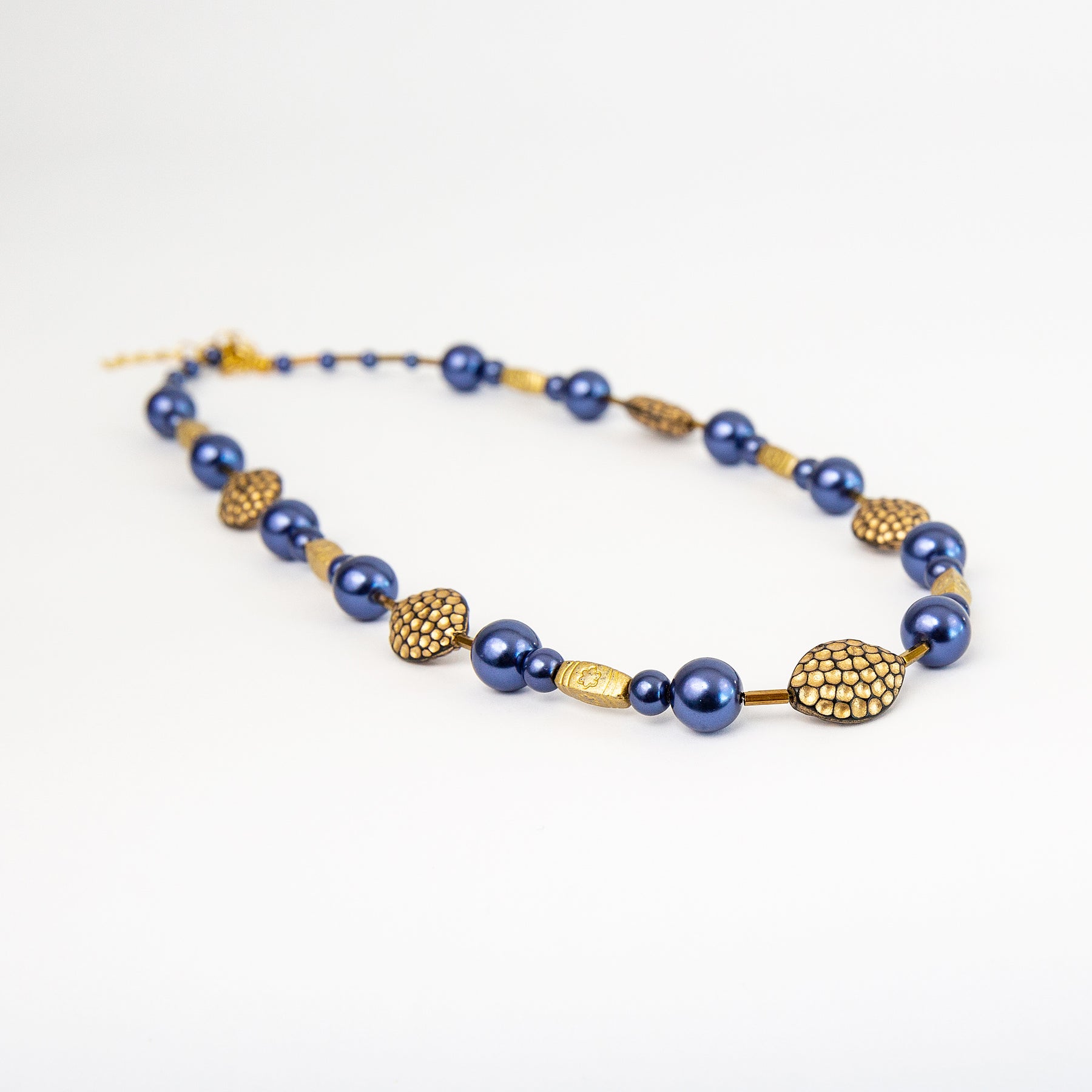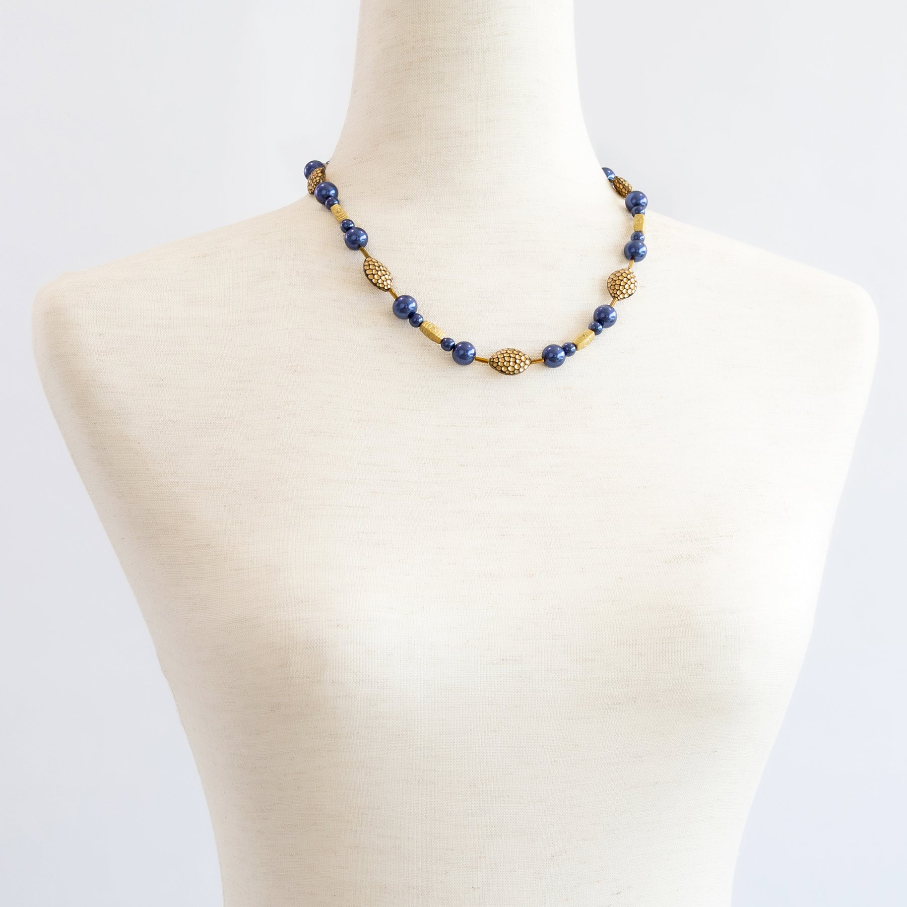 Dark blue glass pearls with metal spacers mixed media, clasp, extension. 18"