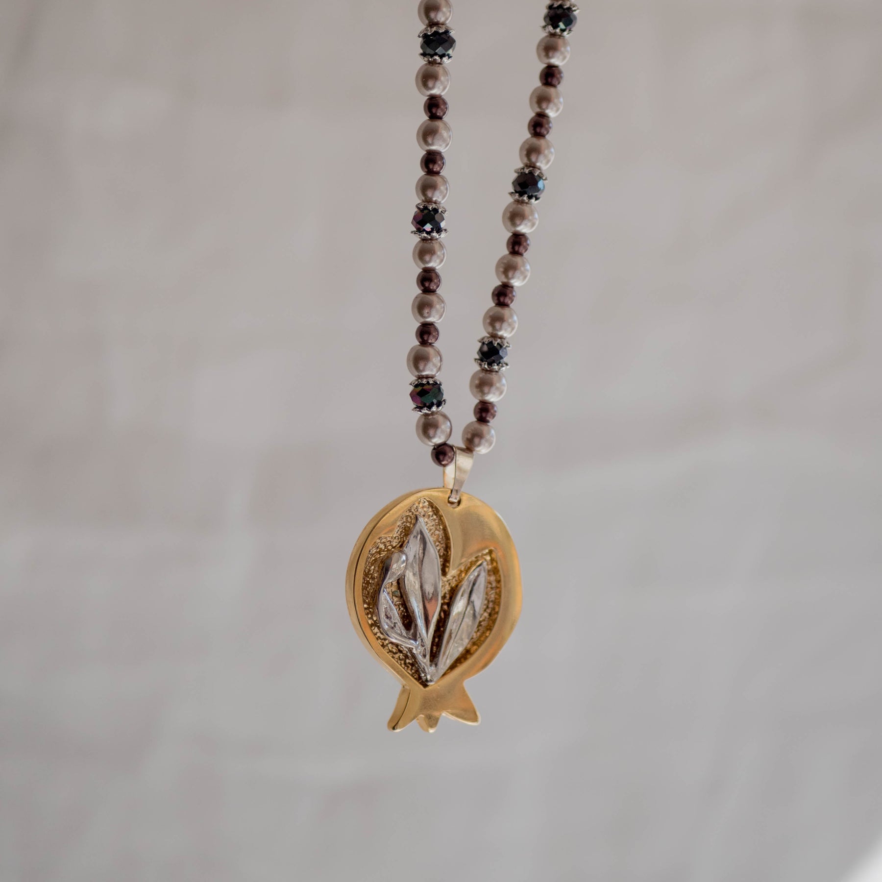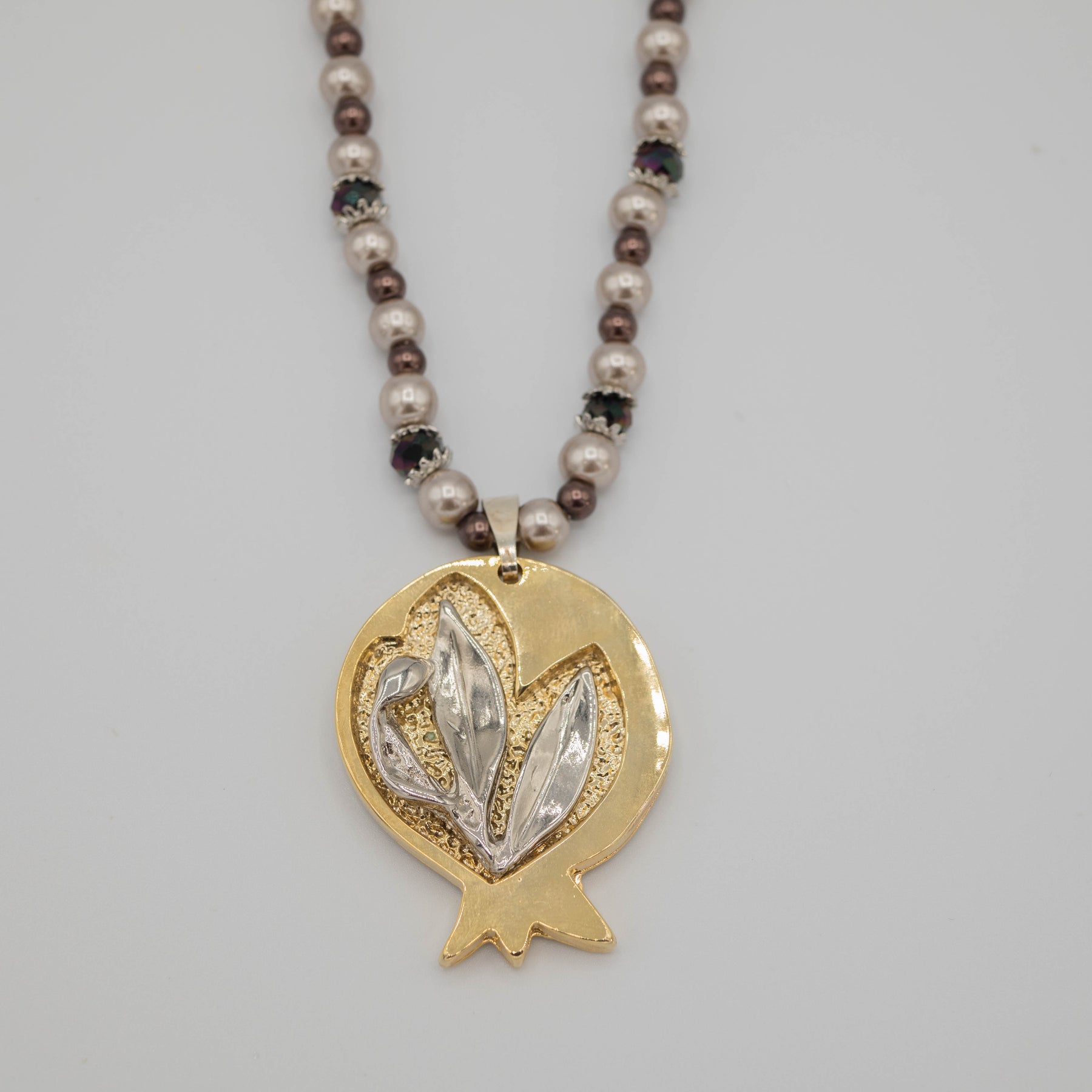 Beautiful ensemble of glass pearls, faceted beads and spacers with a unique gold plated pomegranate pendant base with a silver branch in the center - clasp and extension