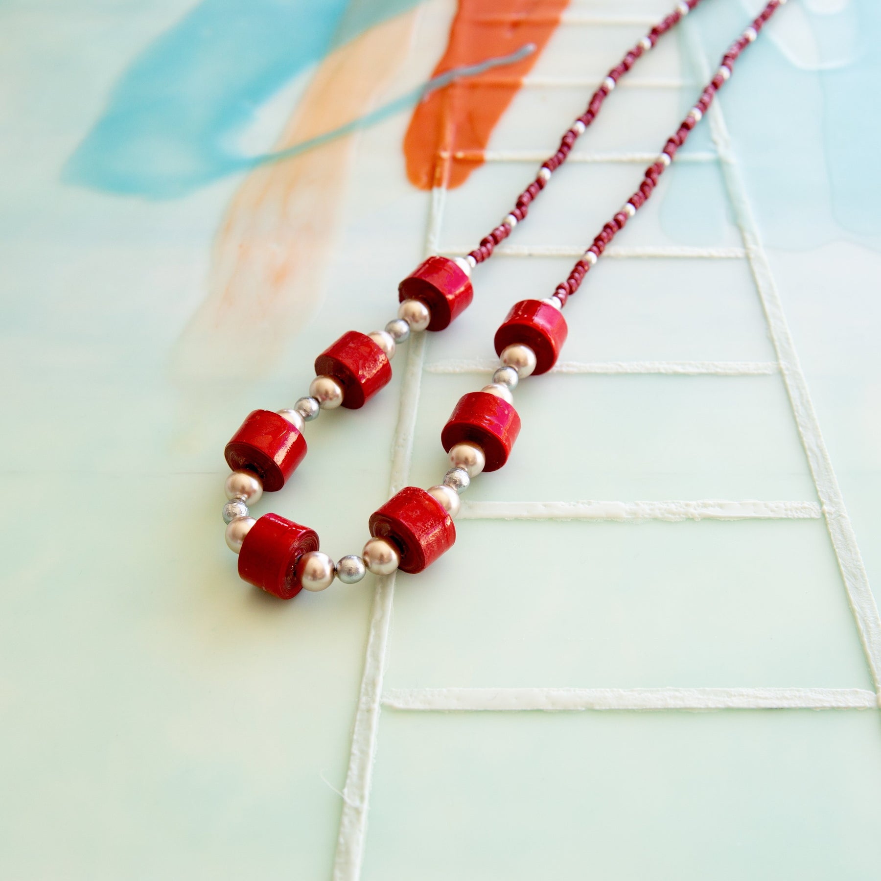 Large red paper beads grouped with silver and gold color glass pearls, crimson red glass beads, clasp and extender, 28 inches long.