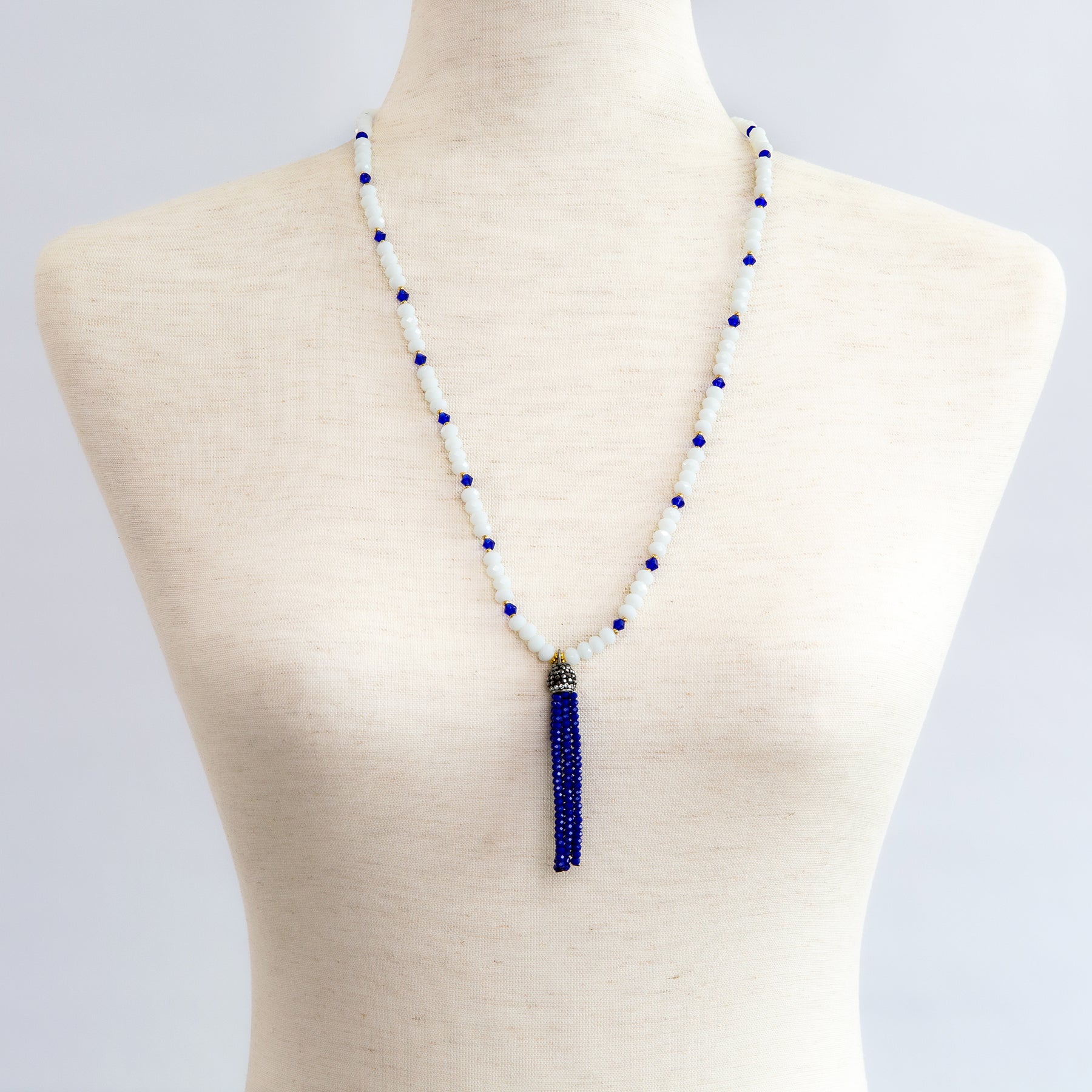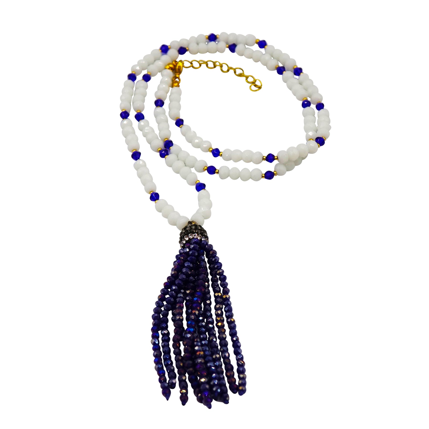 Faceted white quartz with bycone blue and gold spacers, with vibrant blue crystal tassel. clasp and extension.