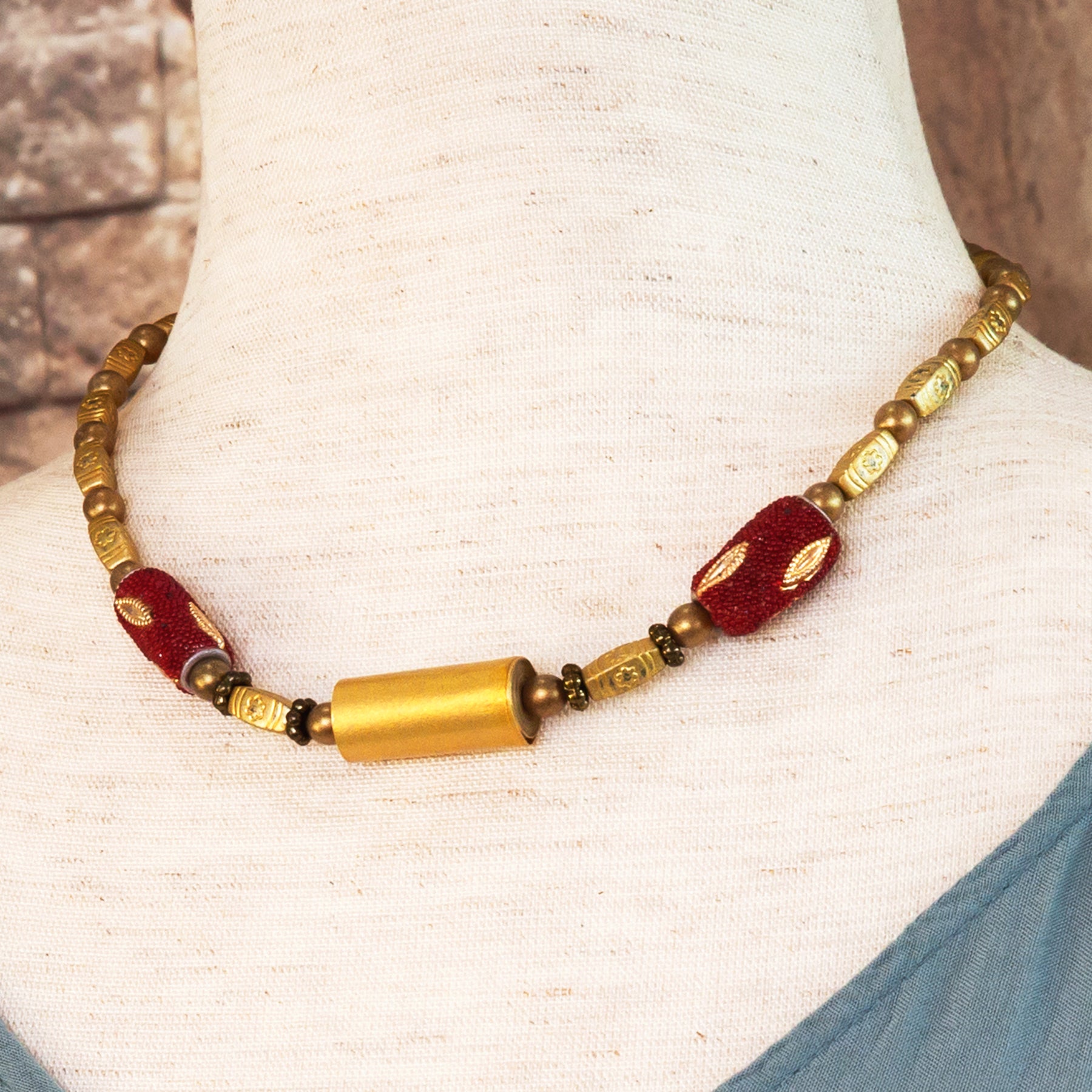 Beautiful necklace combines center handpainted gold paper bead, red and gold resin beads, clasp with chain extension. This gold and red necklace is a great addition to your trendy jewelry collection.