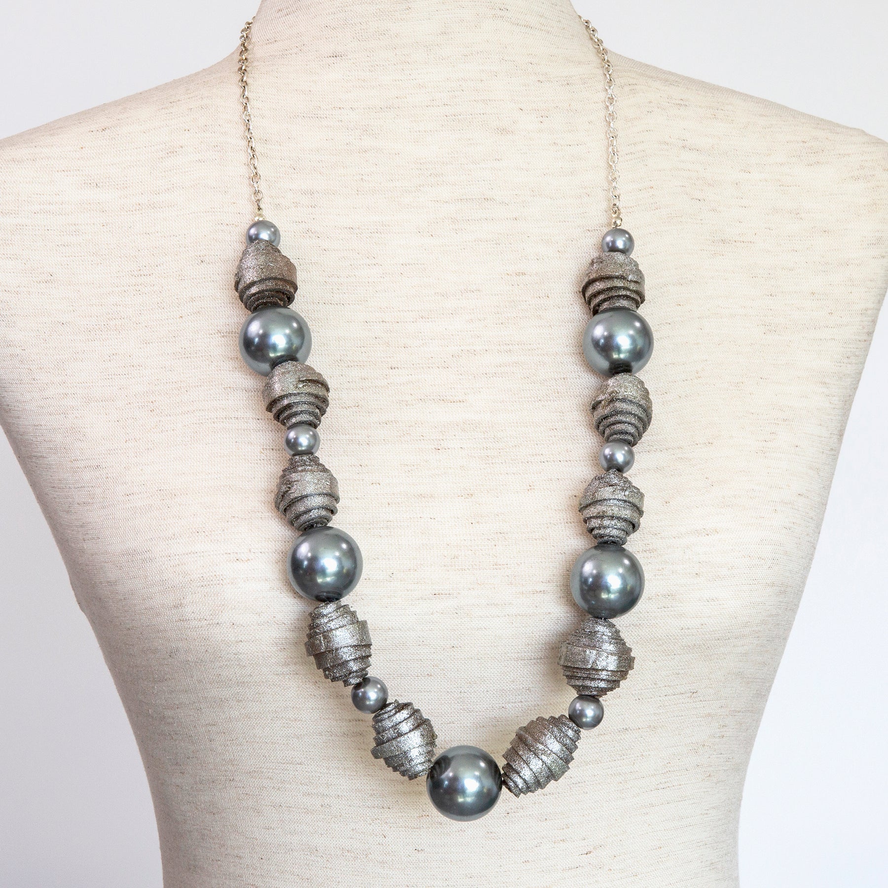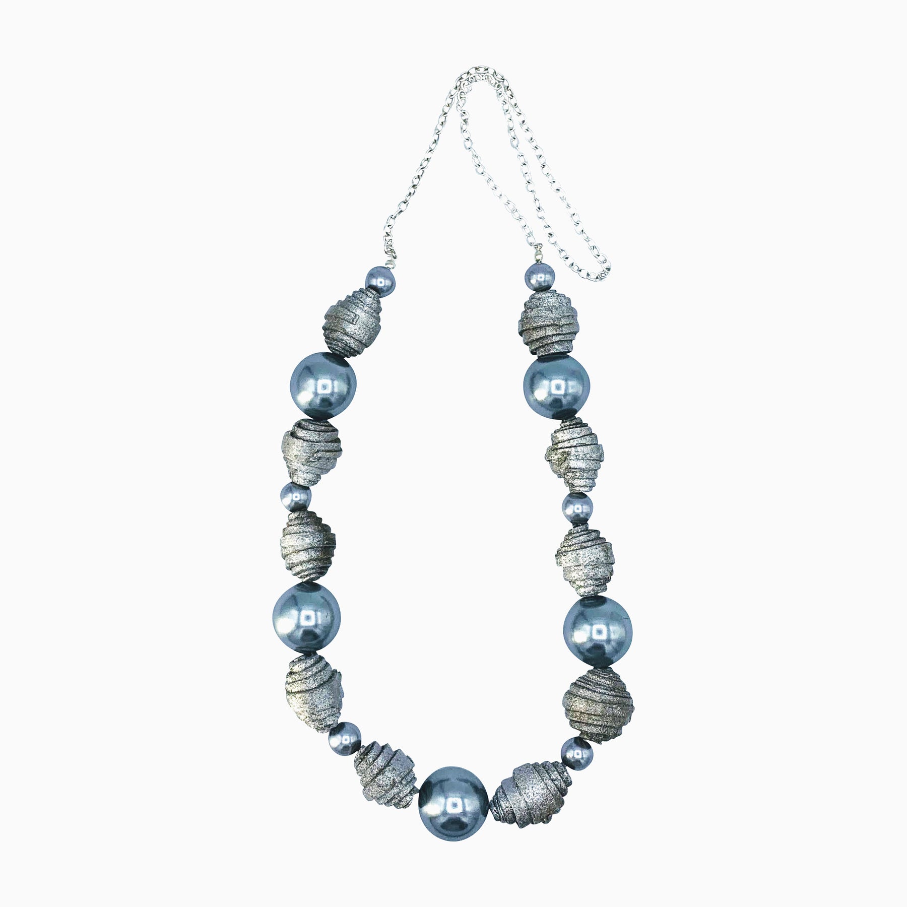 Bold, elegant and lightweight. The Silver hues from the large card beads, added to large glass pearls make this necklace perfect for day-time as well as night-time wear. It is a great necklace to update any outfit, silver clasp, chain extension.
