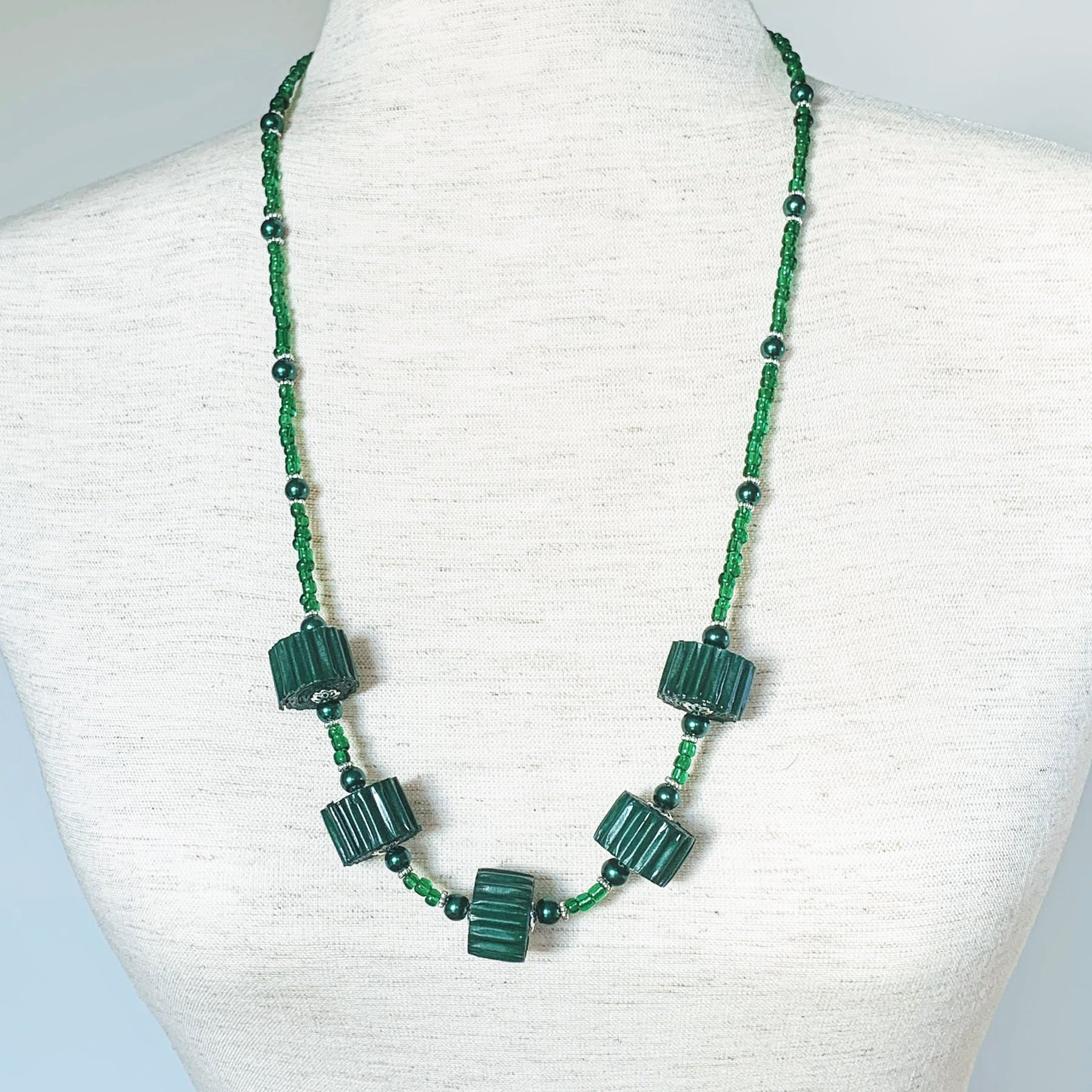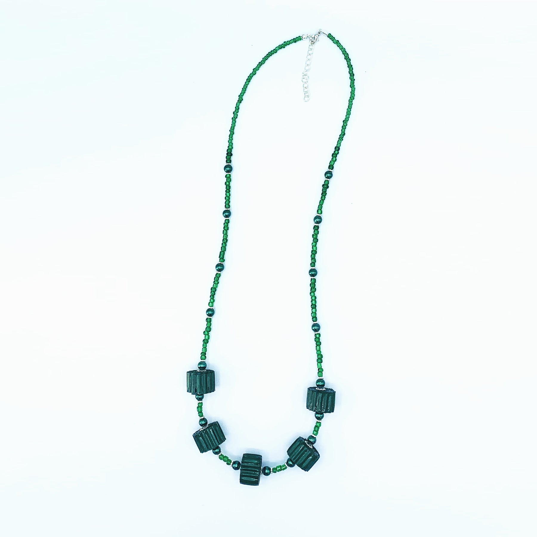This necklace combines lively royal blue paper beads, wood and glass beads, silver clasp with extension. Each piece is unique just like you.