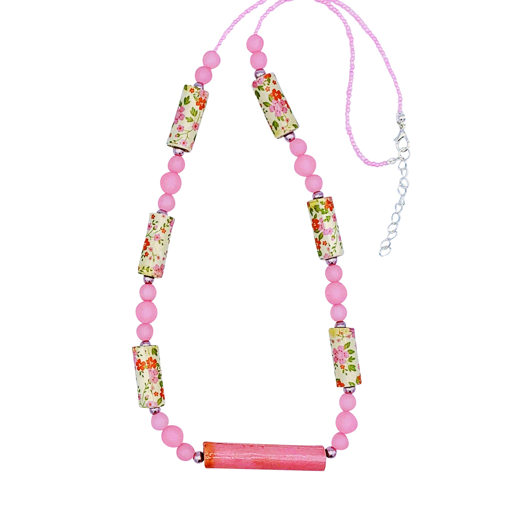 Beautiful paper beads in pink with floral motif combined with glass and resin beads in beautiful hues of pink. Silver clasp with extension. Handcrafted with love. Wear it proudly knowing that your purchase helps the needy in Israel.
