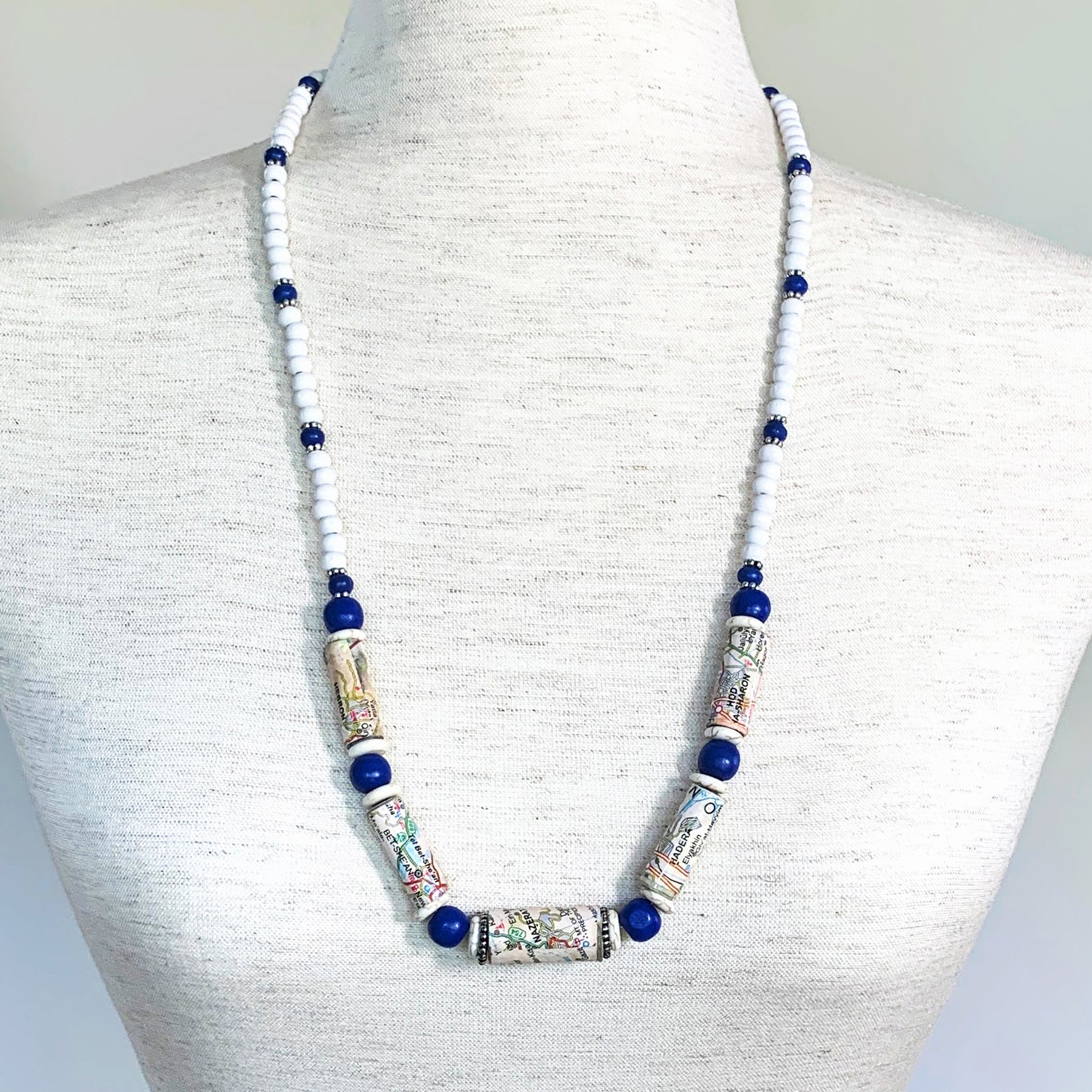 The Map Israel Necklace, center bead Nazareth. Paper beads combined with blue wood beads and white glass beads, clasp with extender, Simply a great conversation piece.