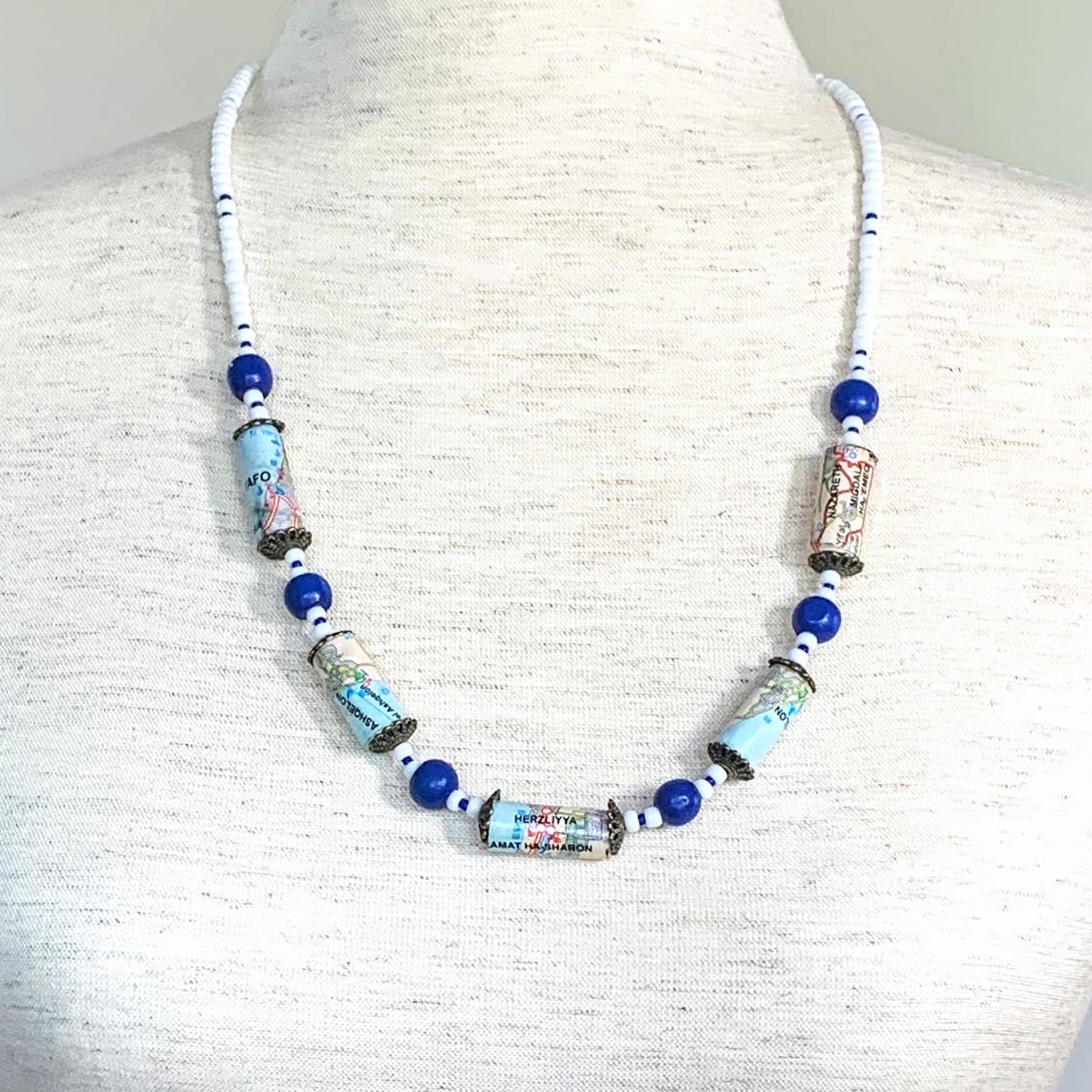 Our Amazing Map of Israel with center bead Ramat HaSharon, combines with blue and white glass and wood beads, clasp with extender.