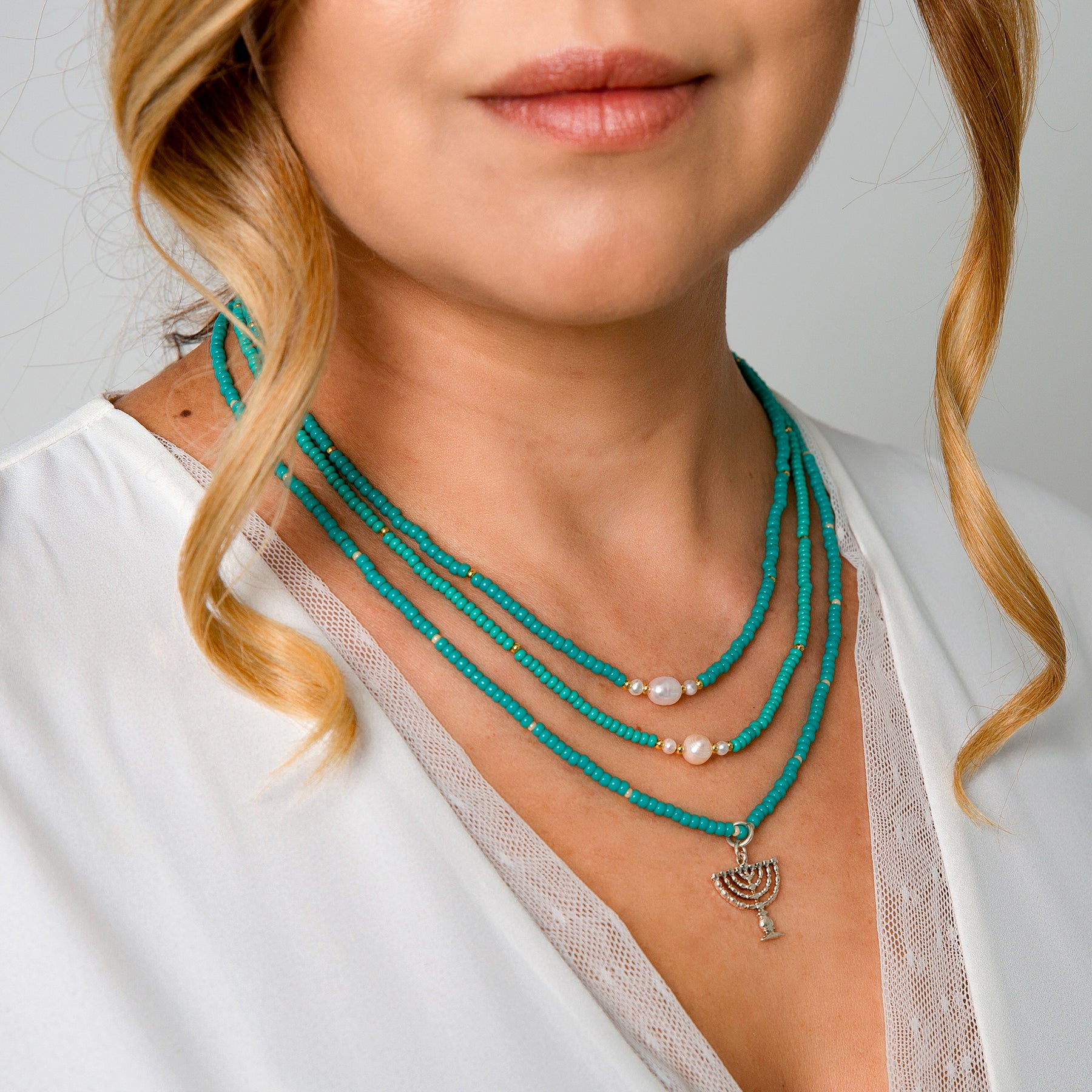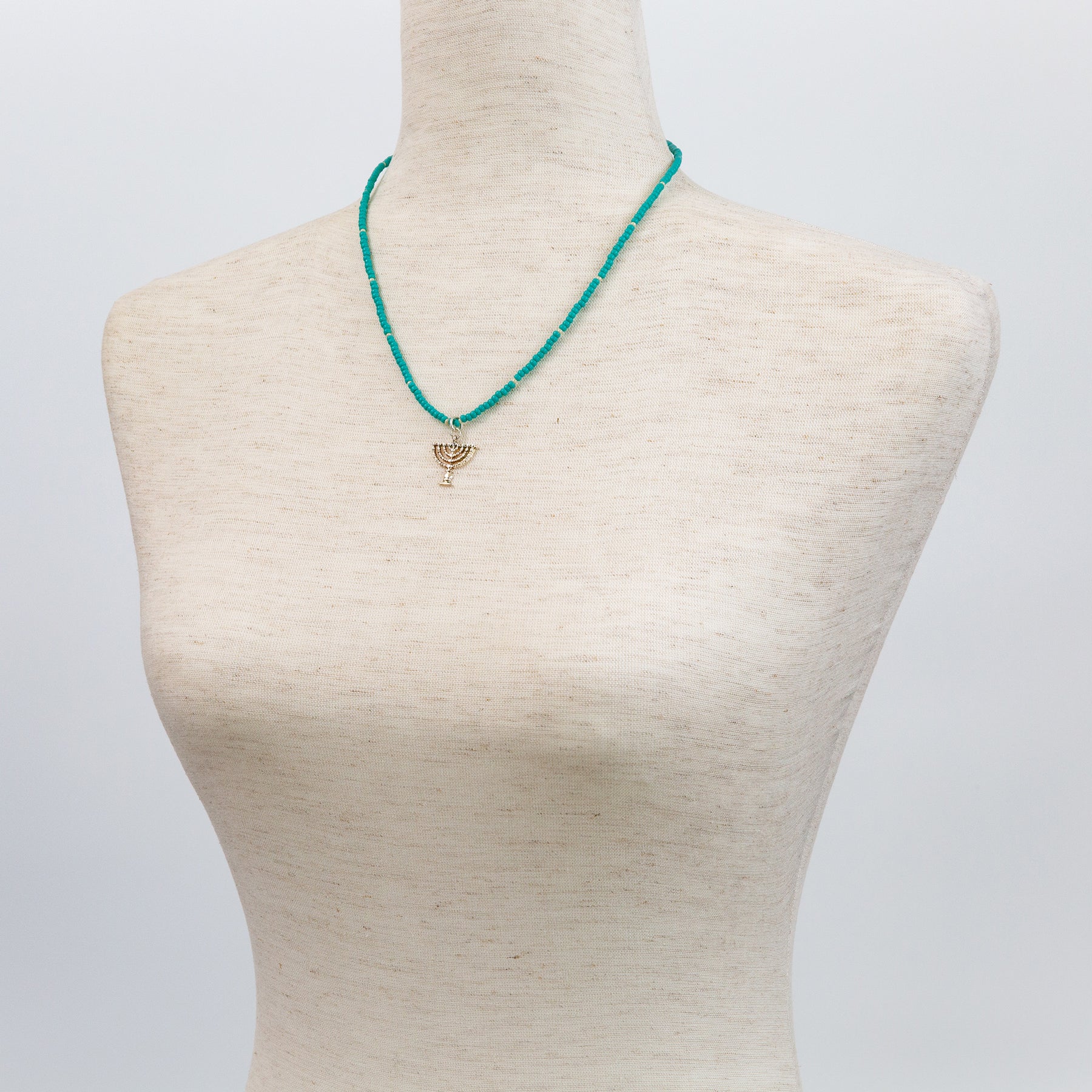 Turquoise color beads, white beads, silver plated menorah pendant.