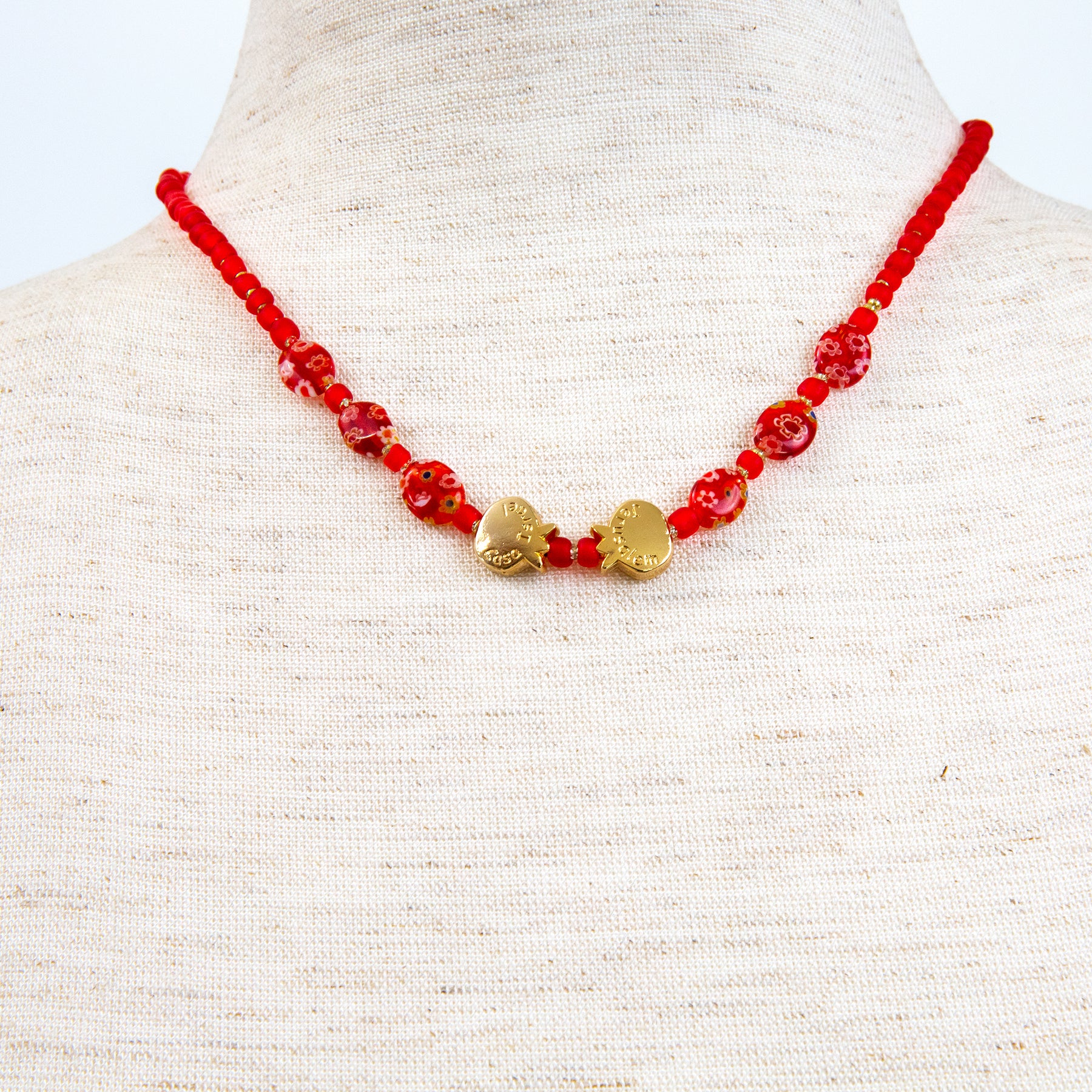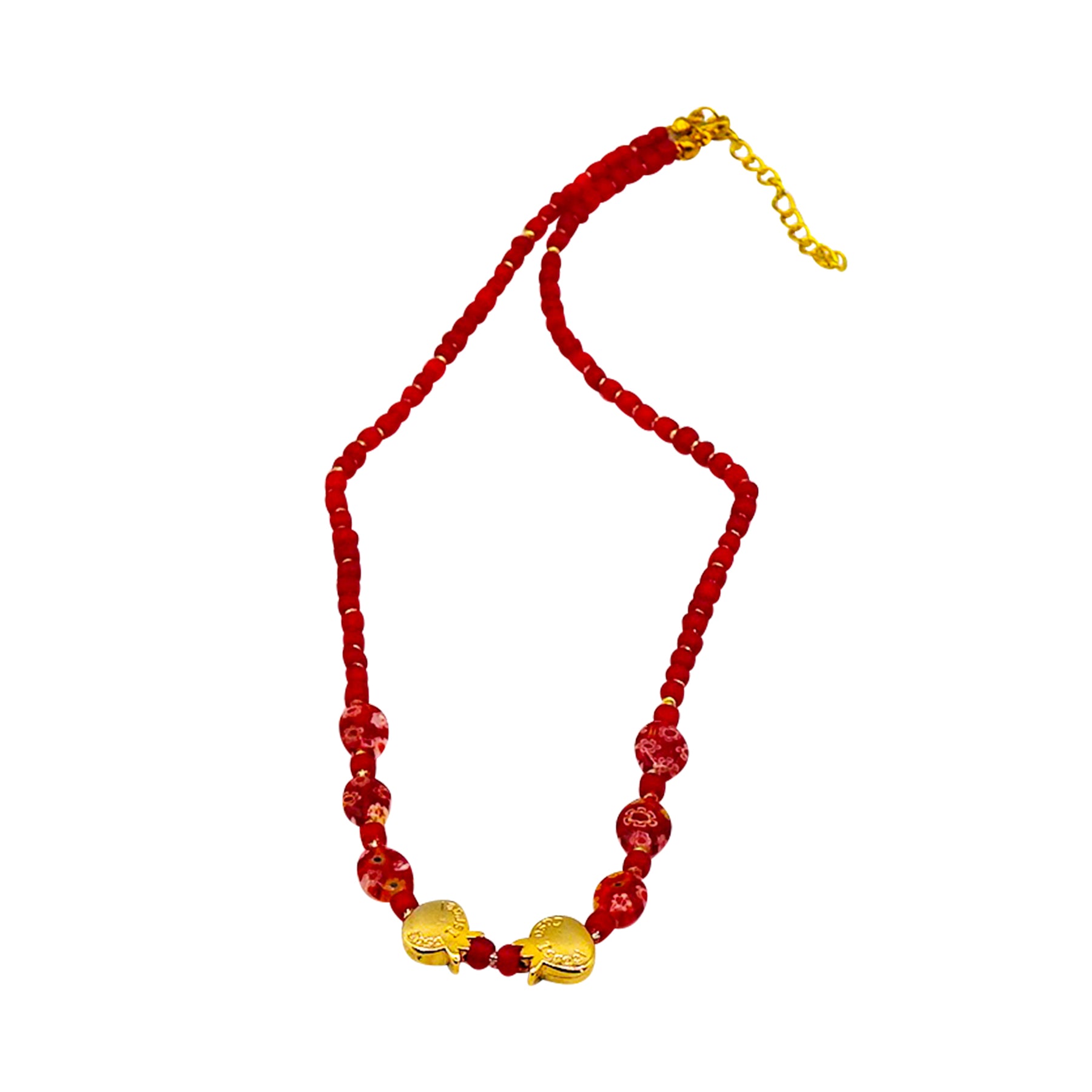 Red millefiori beads, coral red beads with gold color spacers and 2 gold color pomegranates, clasp and extension.