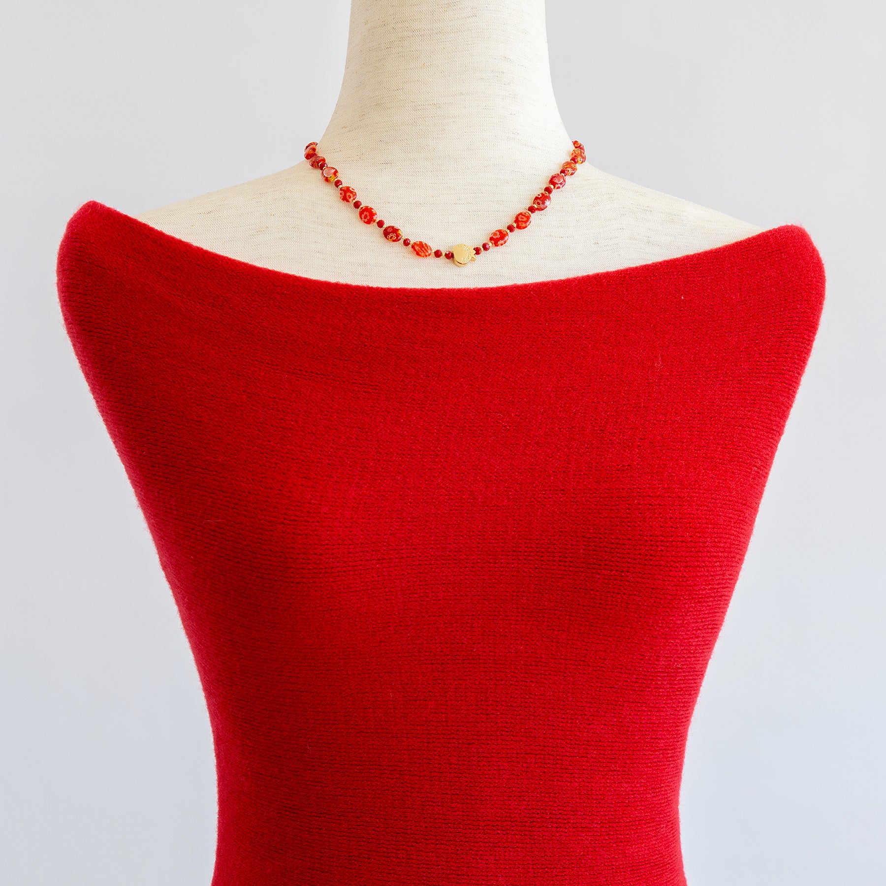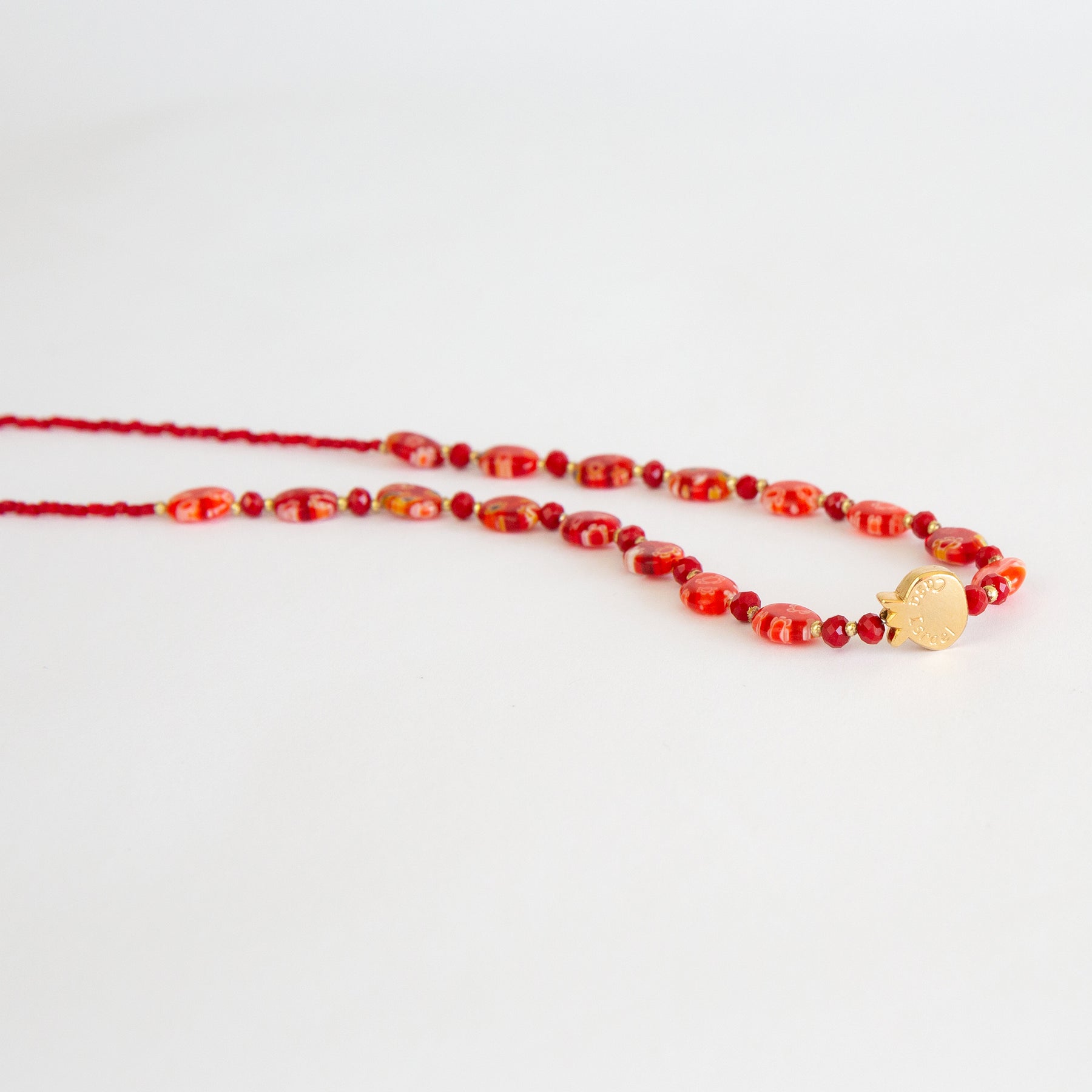 You are going to love to wear this dainty necklace made with red millefiori oval beads with silver spacers and gold color. Casa Israel pomegranate, clasp and extension.