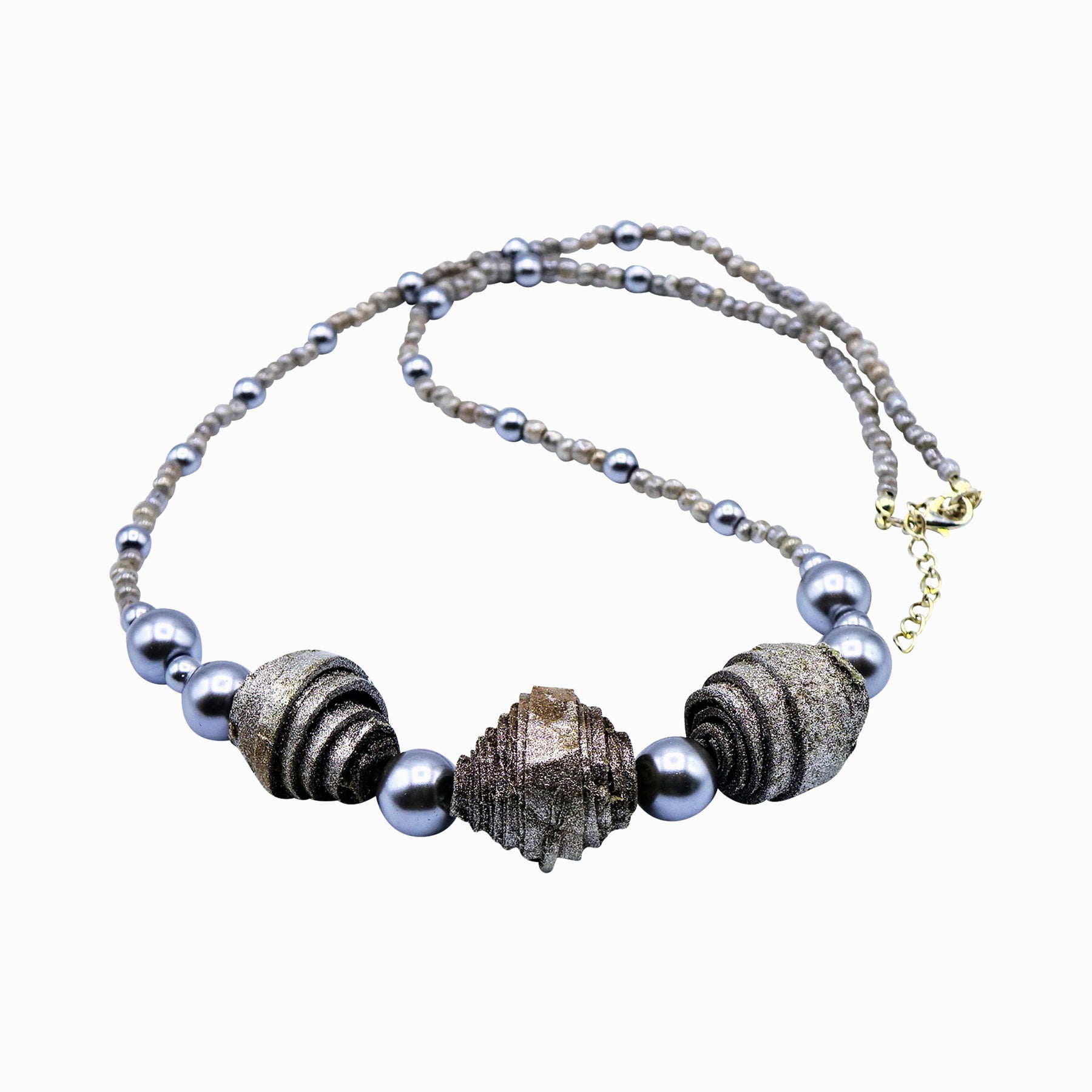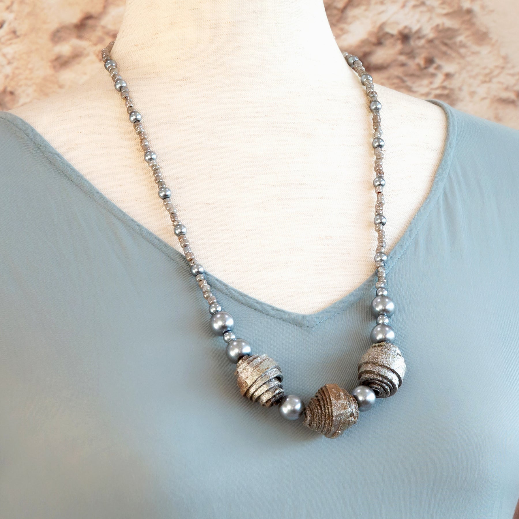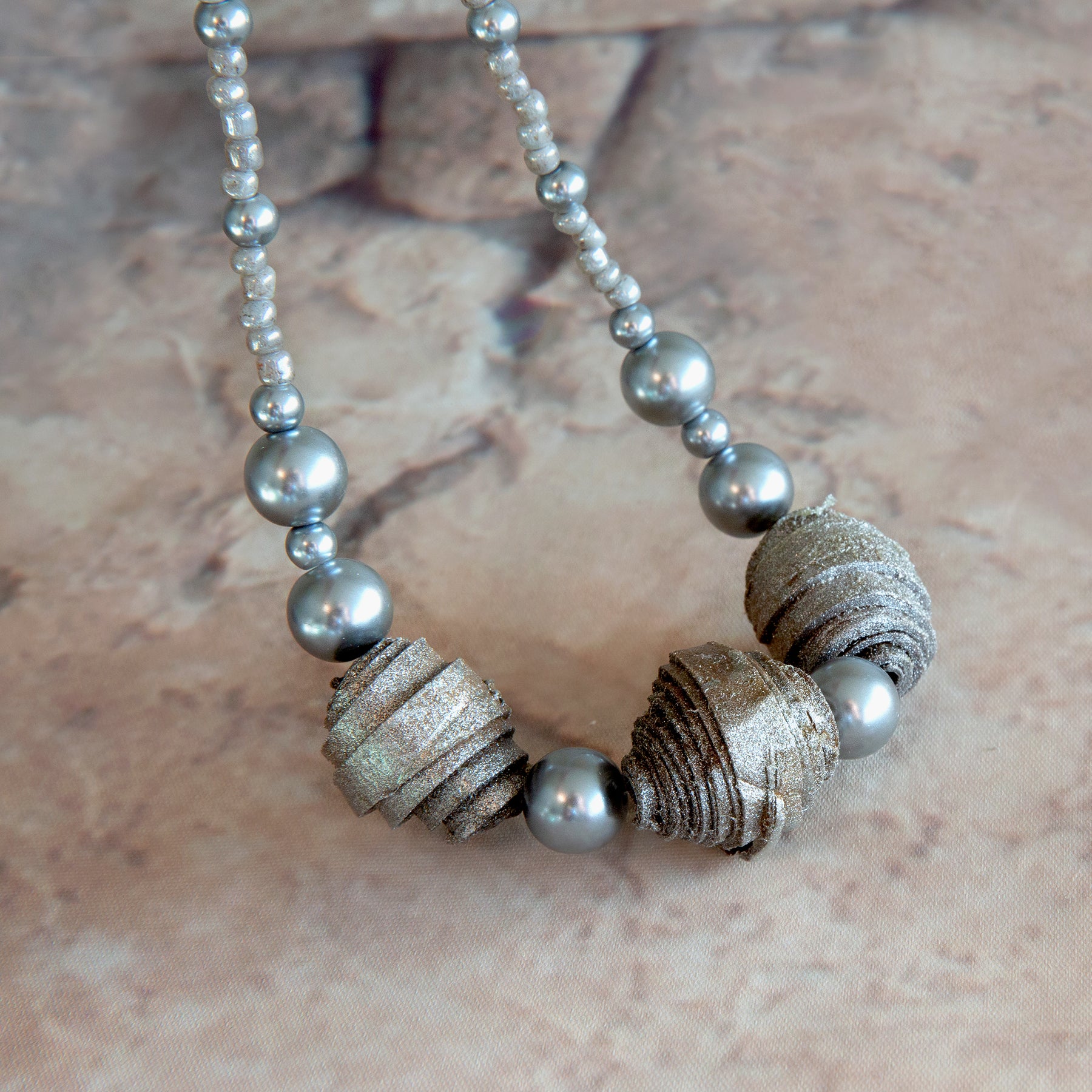 Handmade, one-of-a-kind cardboard beads, painted in old silver, combined with grey glass pearls, clasp and ext.