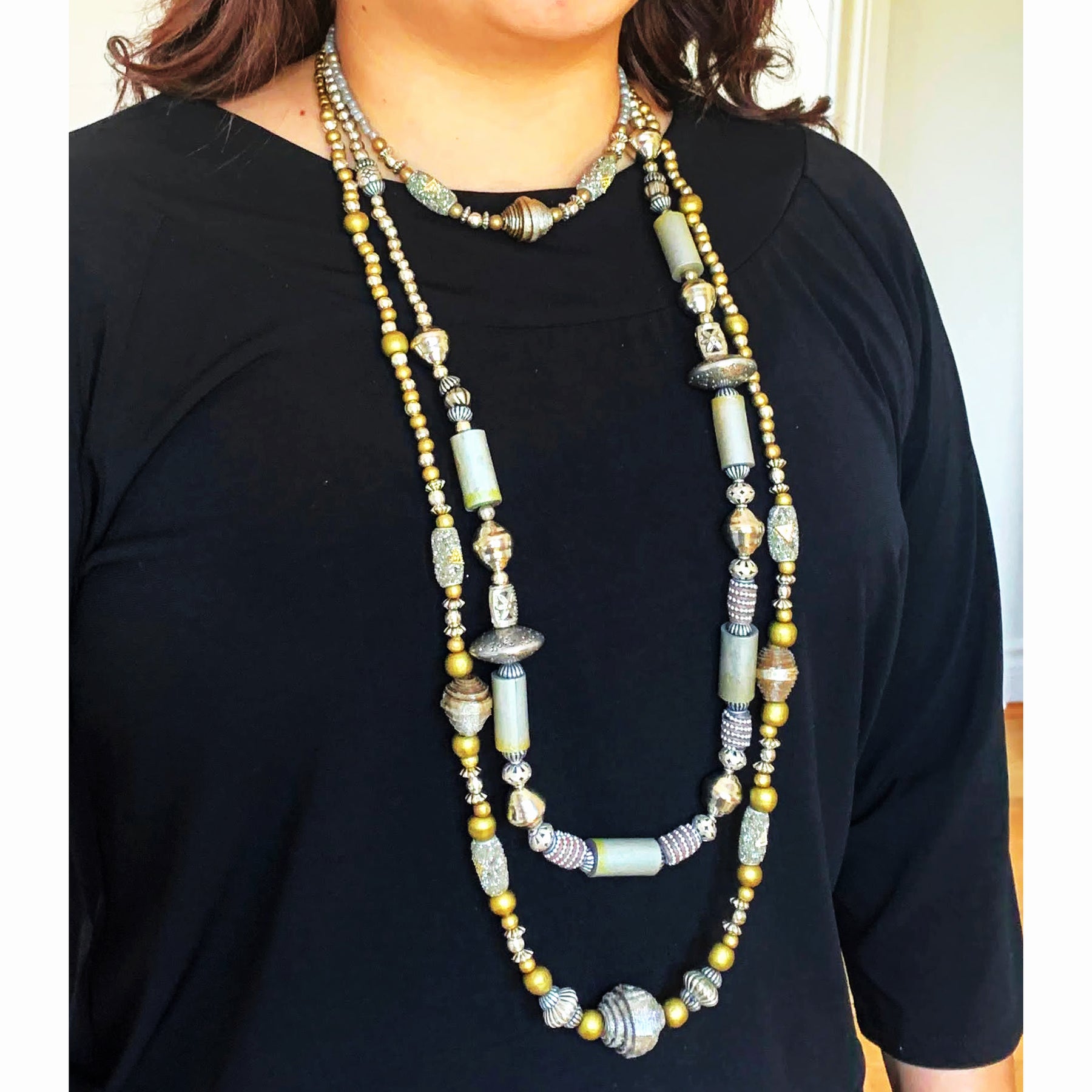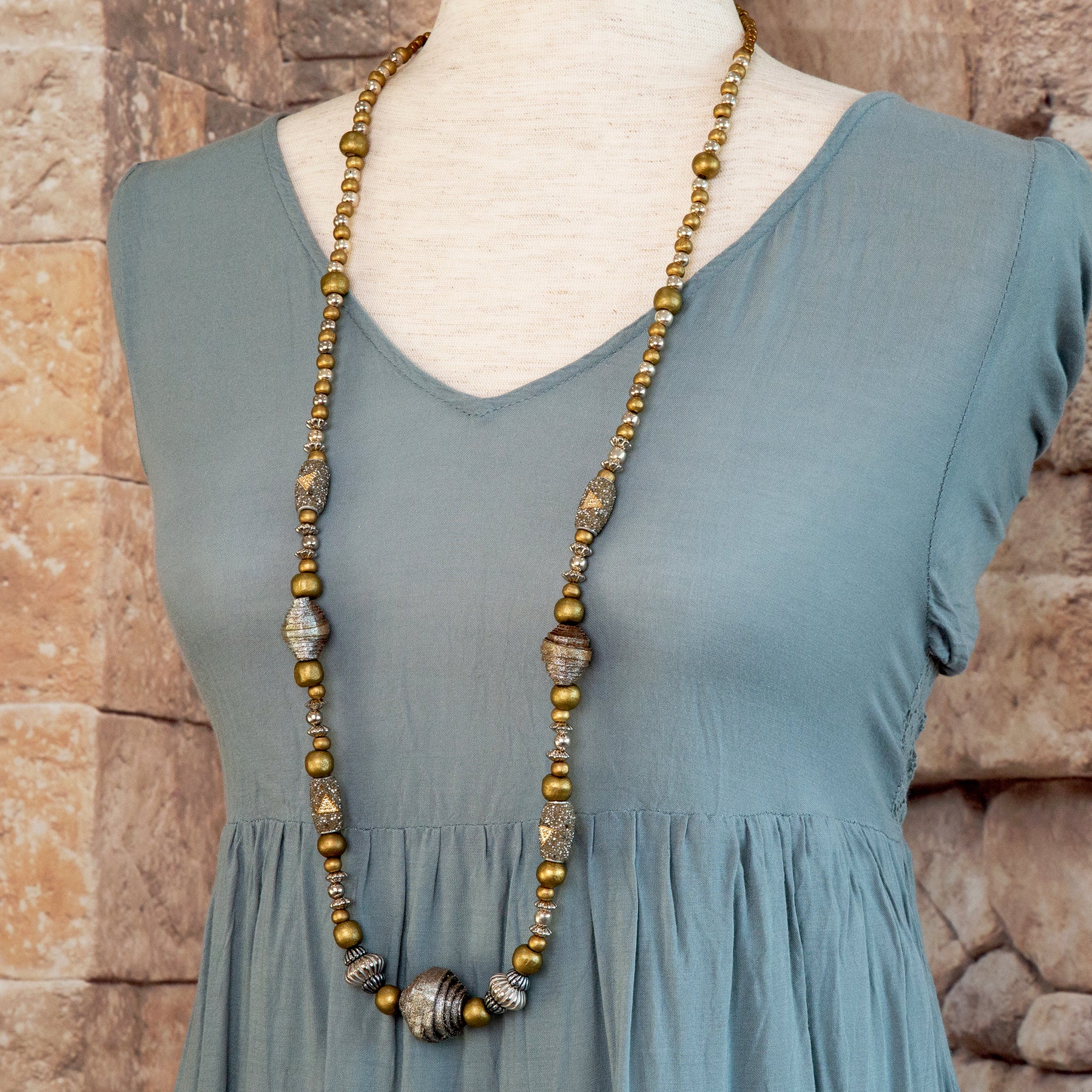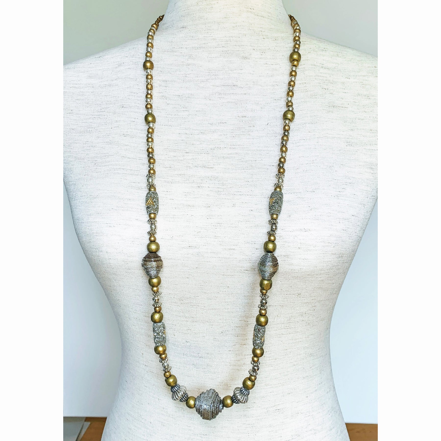 This statement necklace can go from dressy to casual with many different colored outfits. The necklace combines large paper beads complemented with various stylish beads. A stunning style statement and a polished take on modern jewelry.