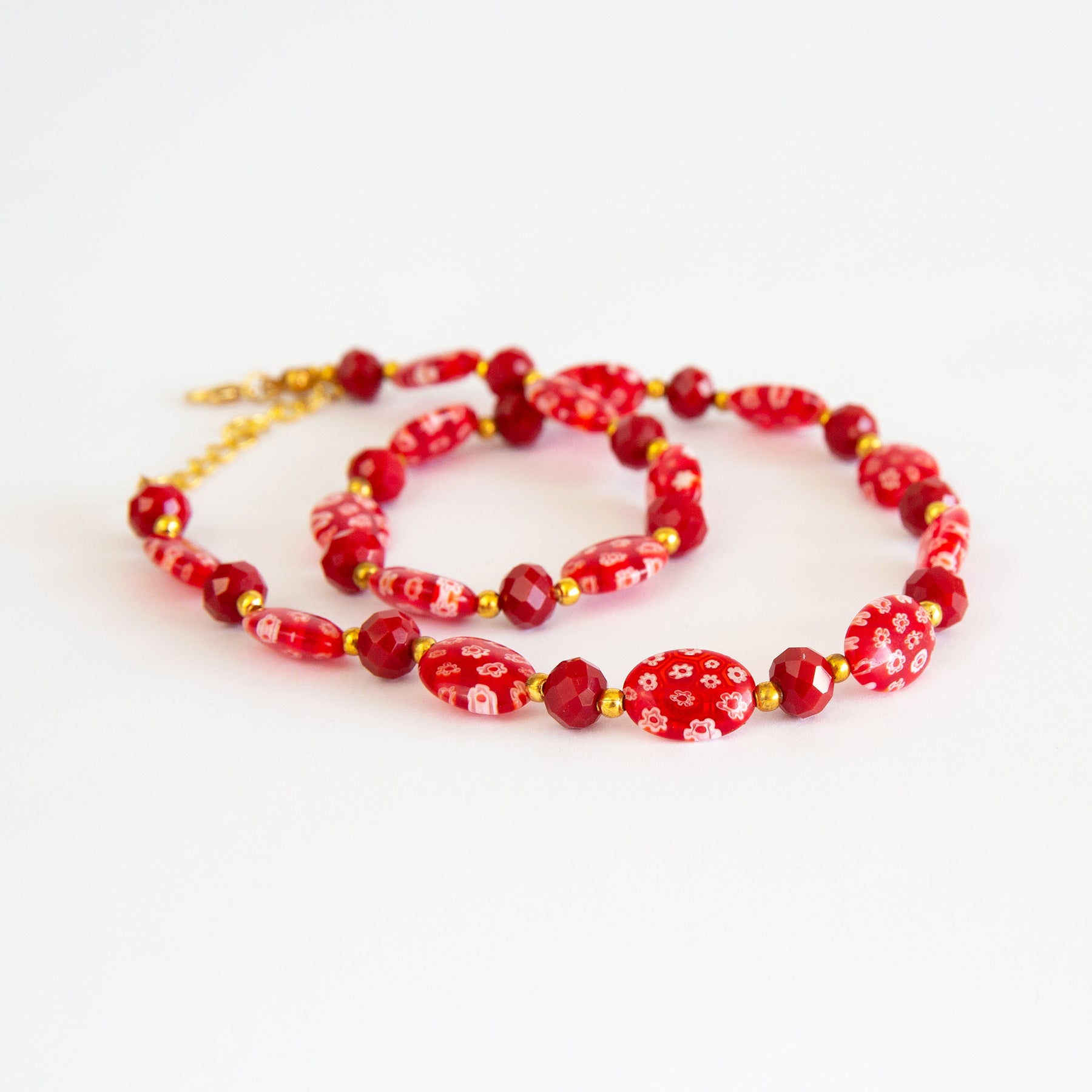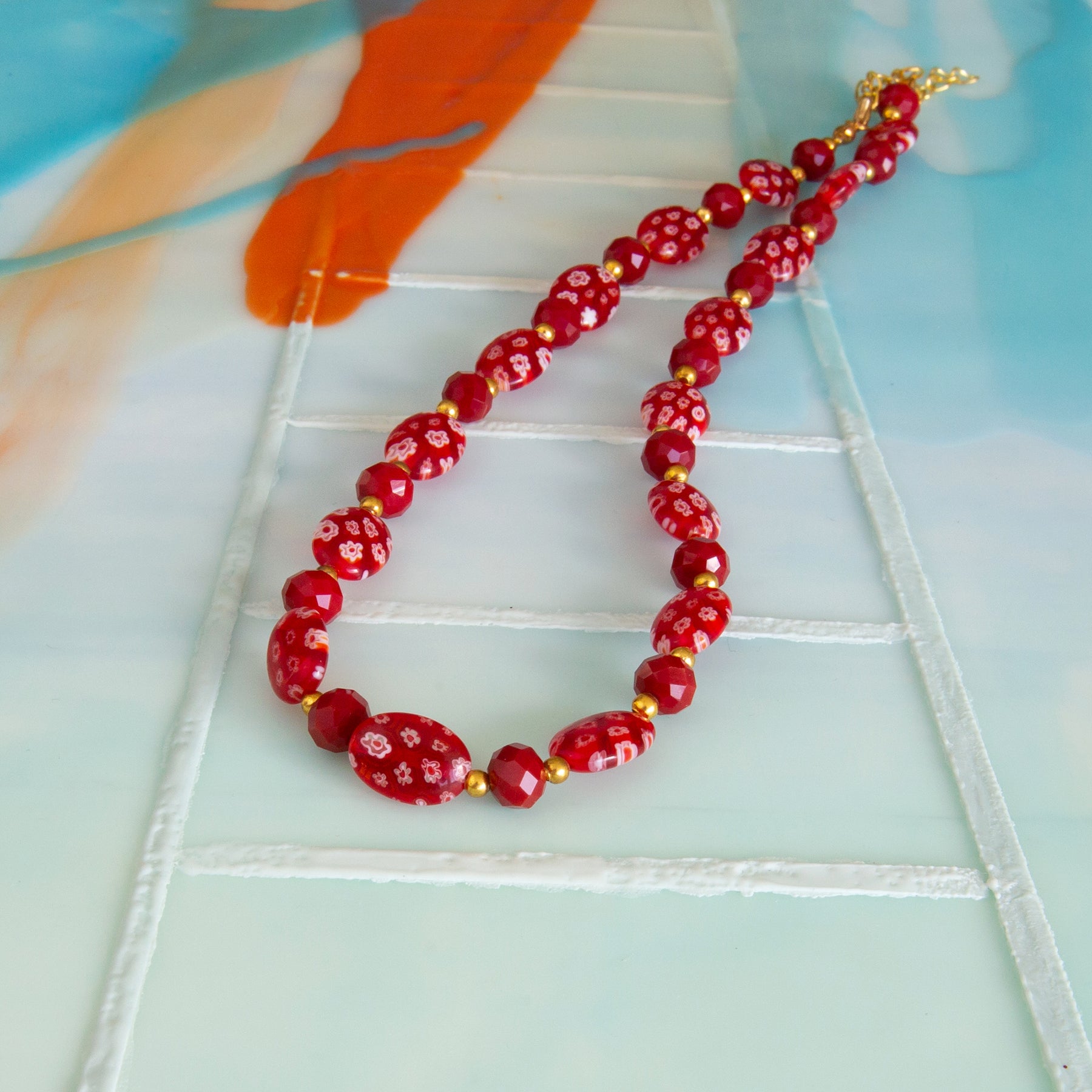 Red millefiori oval beads, faceted crimson and gold spacer beads, clasp and extension