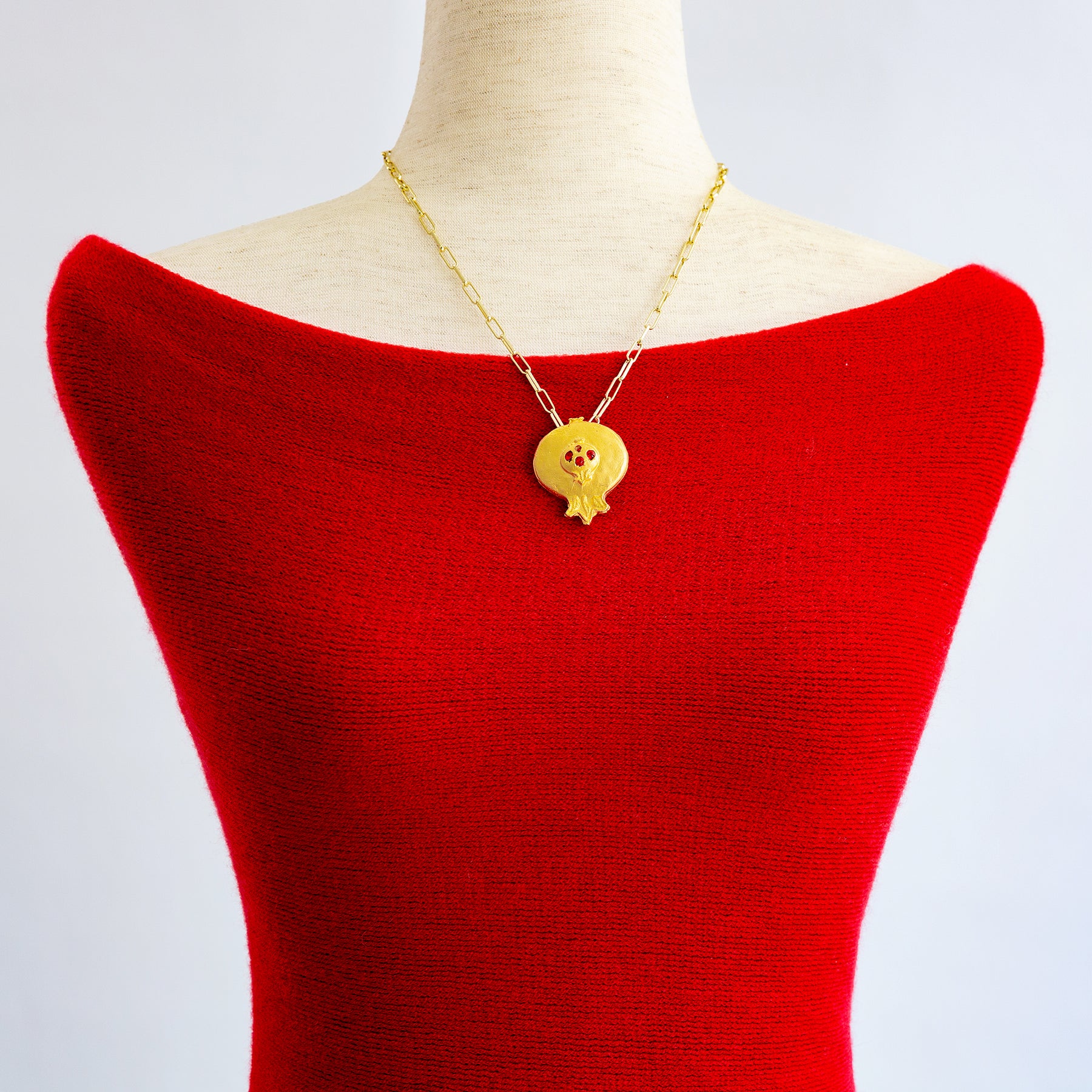 Large gold color pomegranate with red crystals, lovely gold tone paper clip chain.