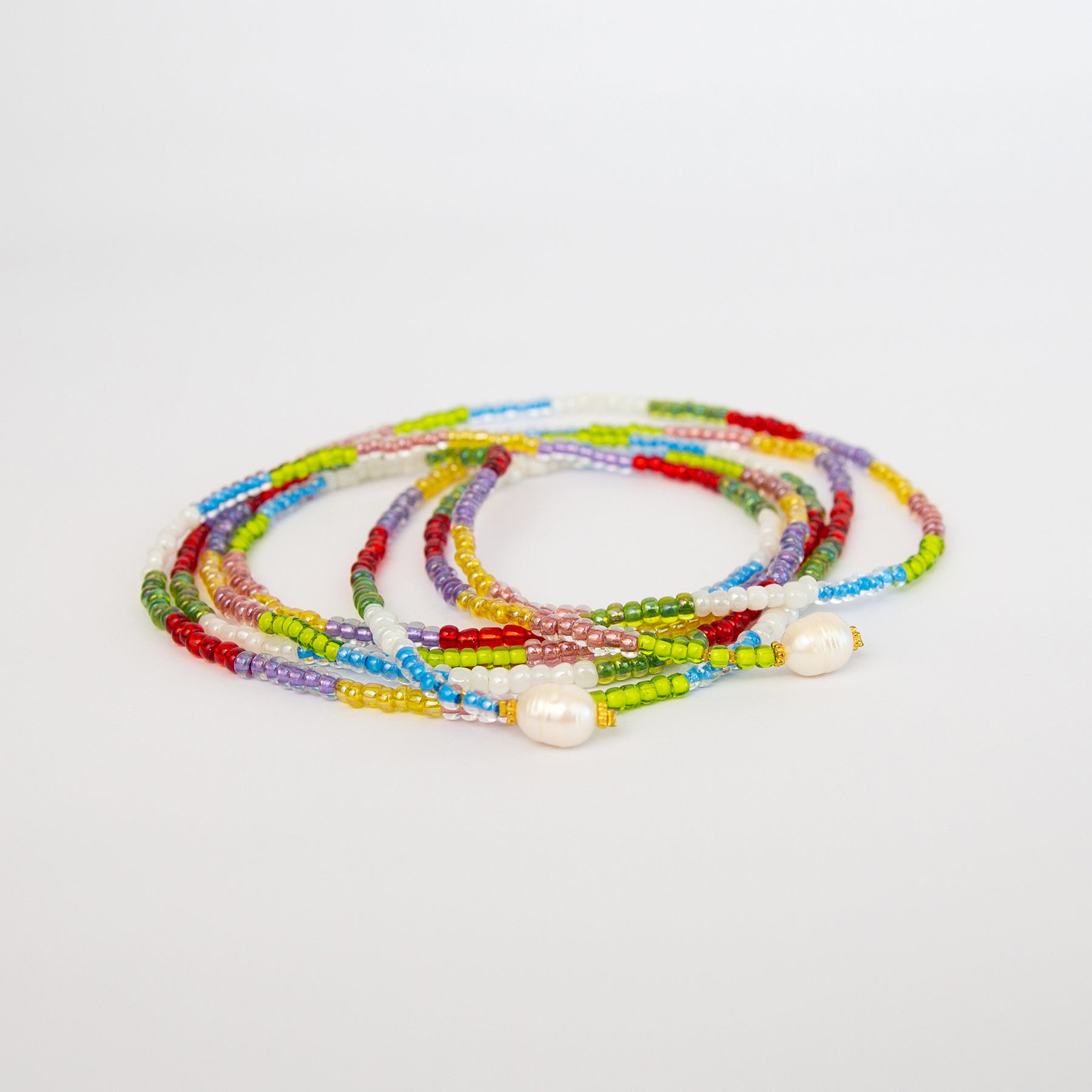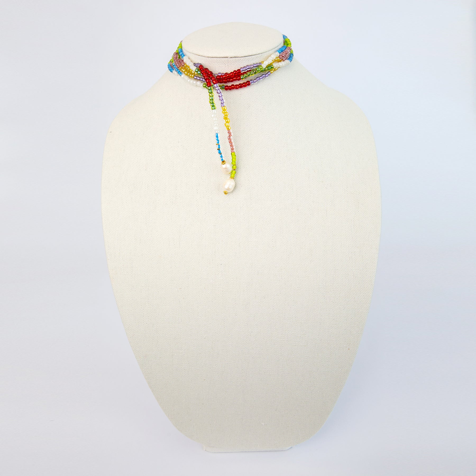 Versatile, colorful and extra long lariat necklace can we worn in many different ways, colorful glass beads ended with 2 large fresh water pearls.