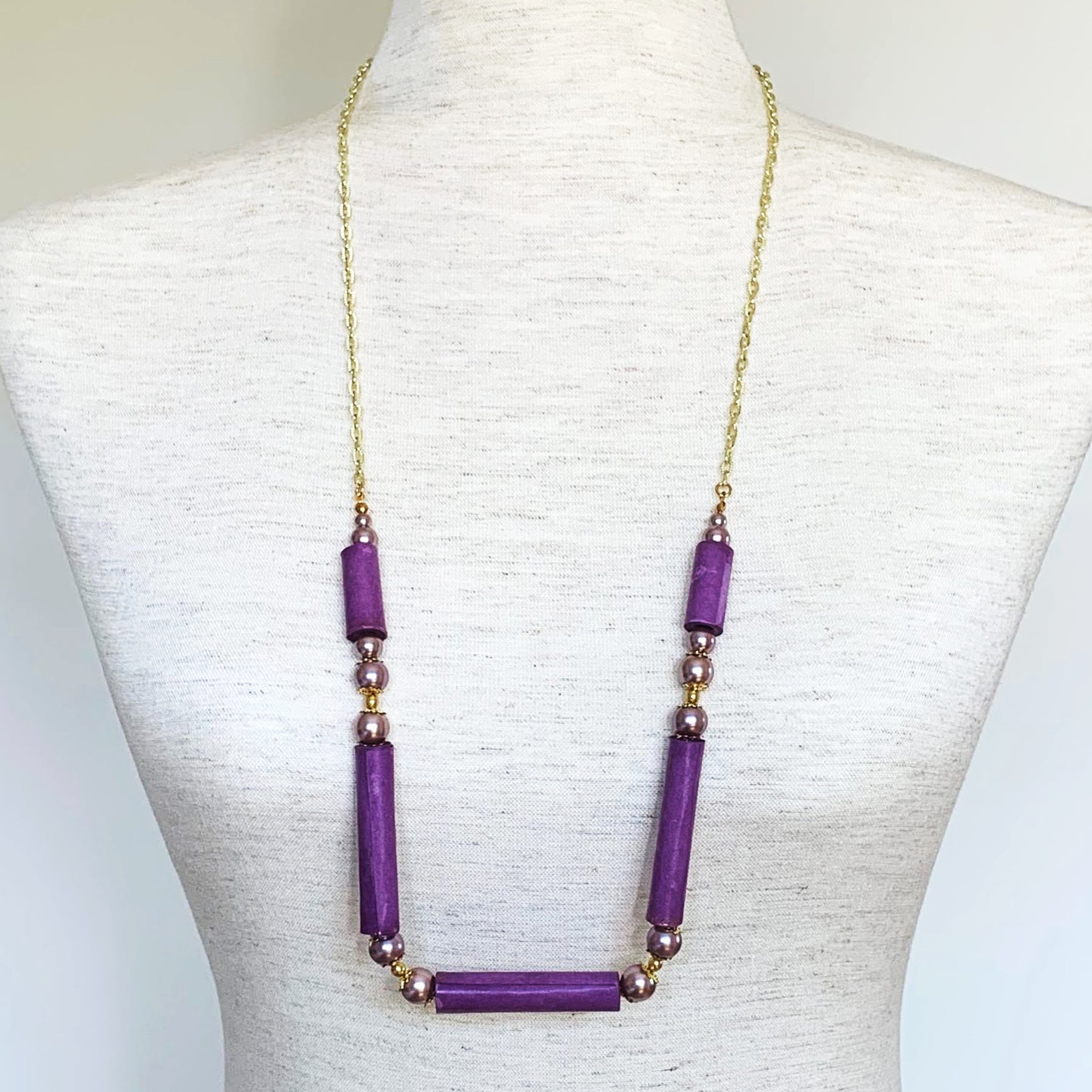 Modern and artful tube paper beads and glass pearls, silver clasp with chain extension. A stunning style statement and a trendy take on jewelry.