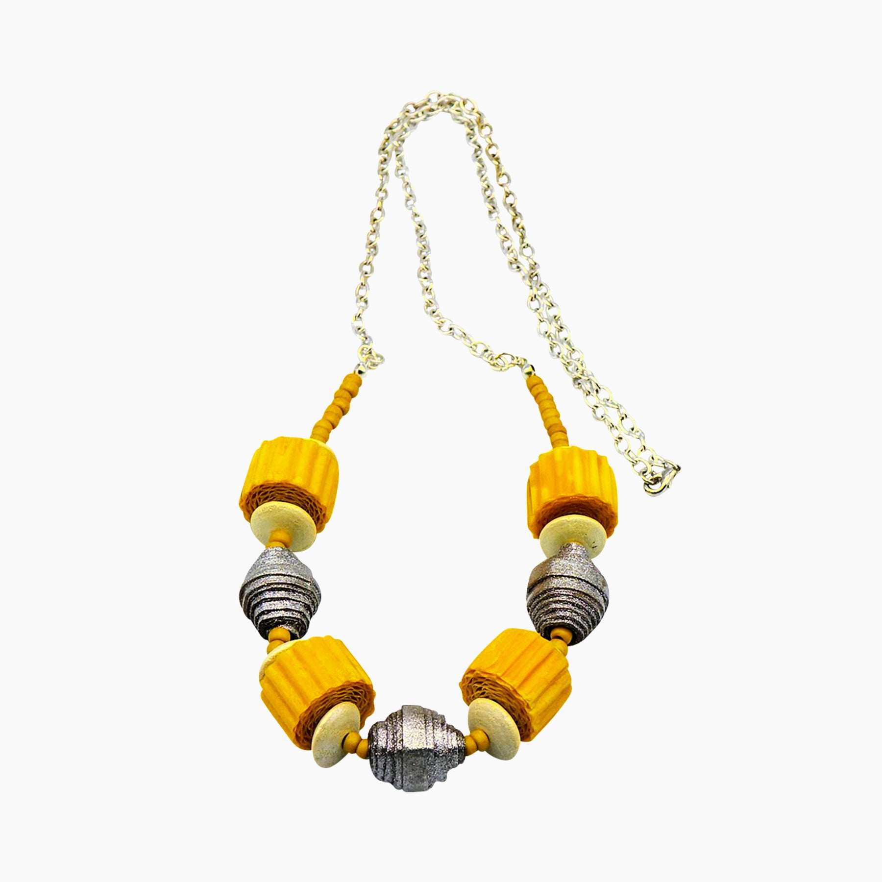 Bold and gorgeous necklace in bright yellow and silver paper beads. combining different materials and textures. Great as a gift for someone you love or for yourself. Simply great jewelry to update any outfit and make a statement!