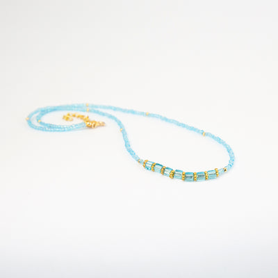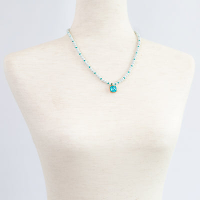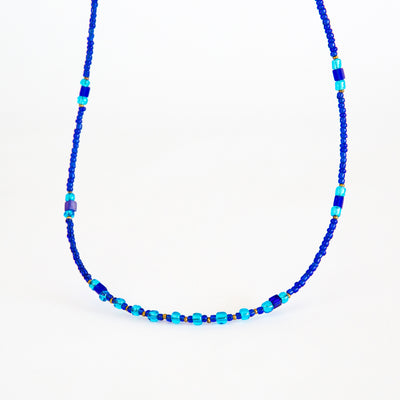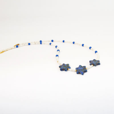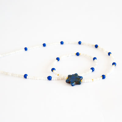 Jewelry made for the Azure collection includes a mixed media of pearl, crystals, glass, and metals in shades of blue and white.