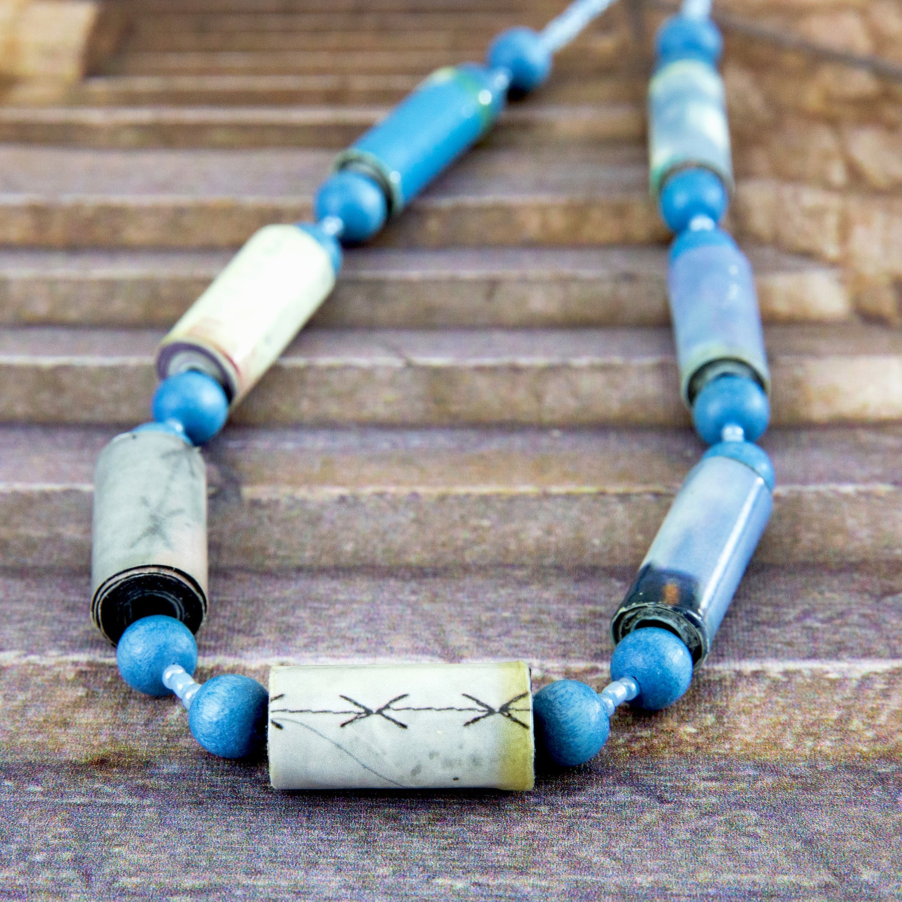 Beautiful necklace in blue hues barrel shape paper beads and round wood beads, glass beads, silver clasp and extender.