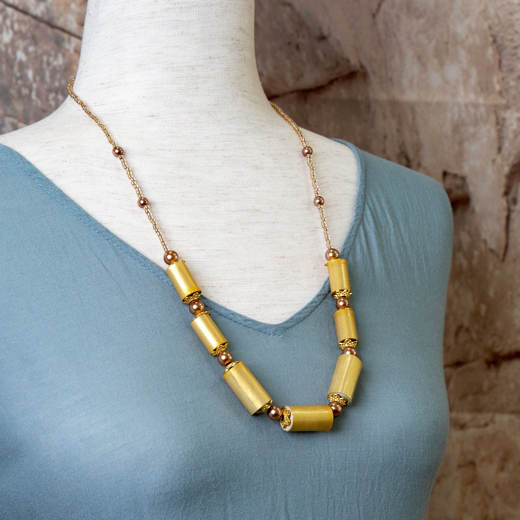 Bold necklace with large corrugated cardboard beads, resin, and glass beads. Beautiful and classy jewelry with a purpose = to support people in need.