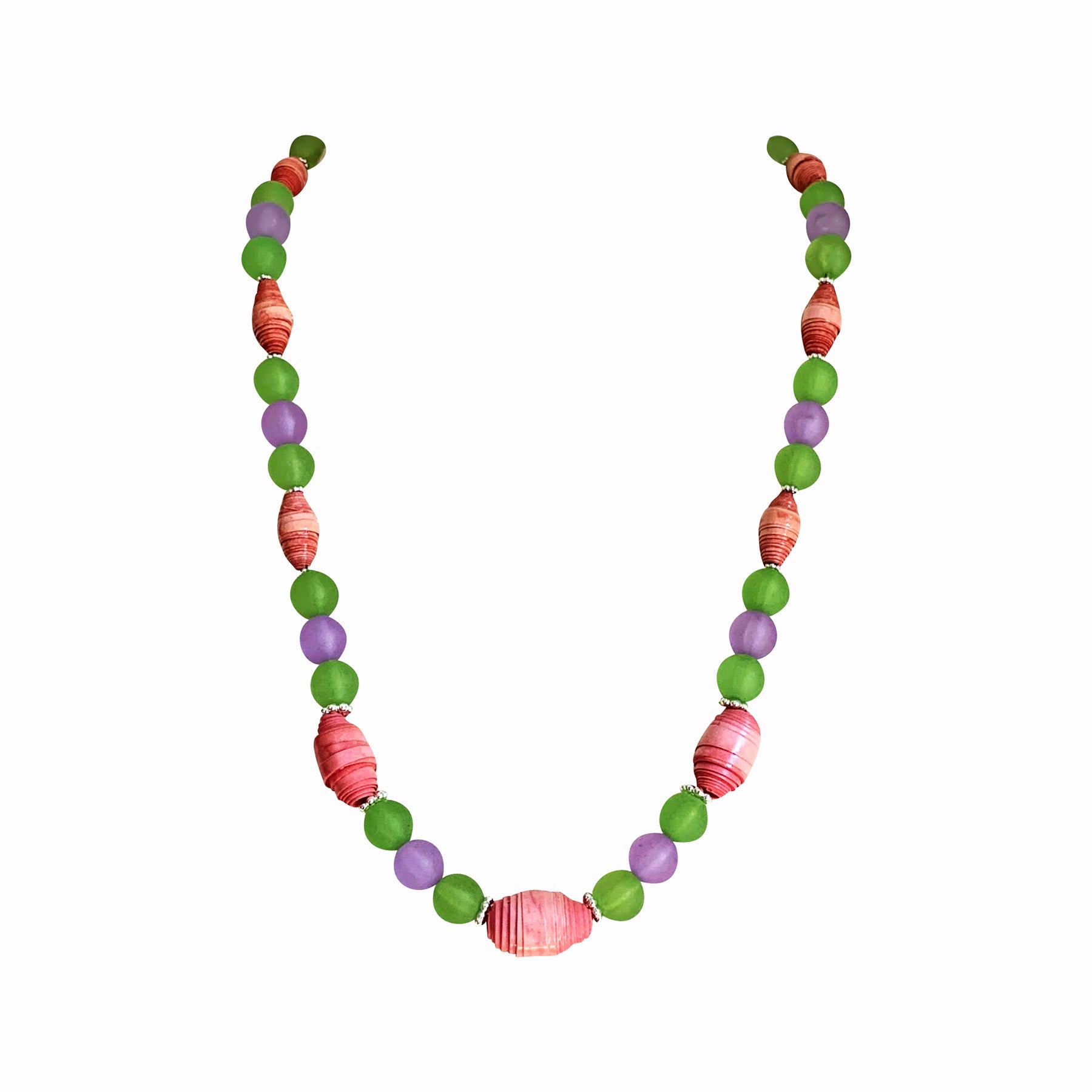 Make a statement with this beautiful necklace with pink paper beads, green and purple resin beads, with silver clasp and extension chain. This necklace may have color variations because of the paper textures. A stunning style statement and a polished take on modern jewelry.