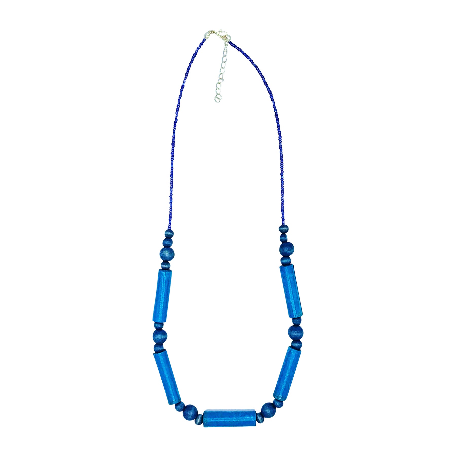 Express your style with this stunning handmade necklace. It combines large royal blue paper beads and blue wood beads, glass seed beads, silver clasp, and extender. It is a great necklace to update any outfit and make a stylish statement.
