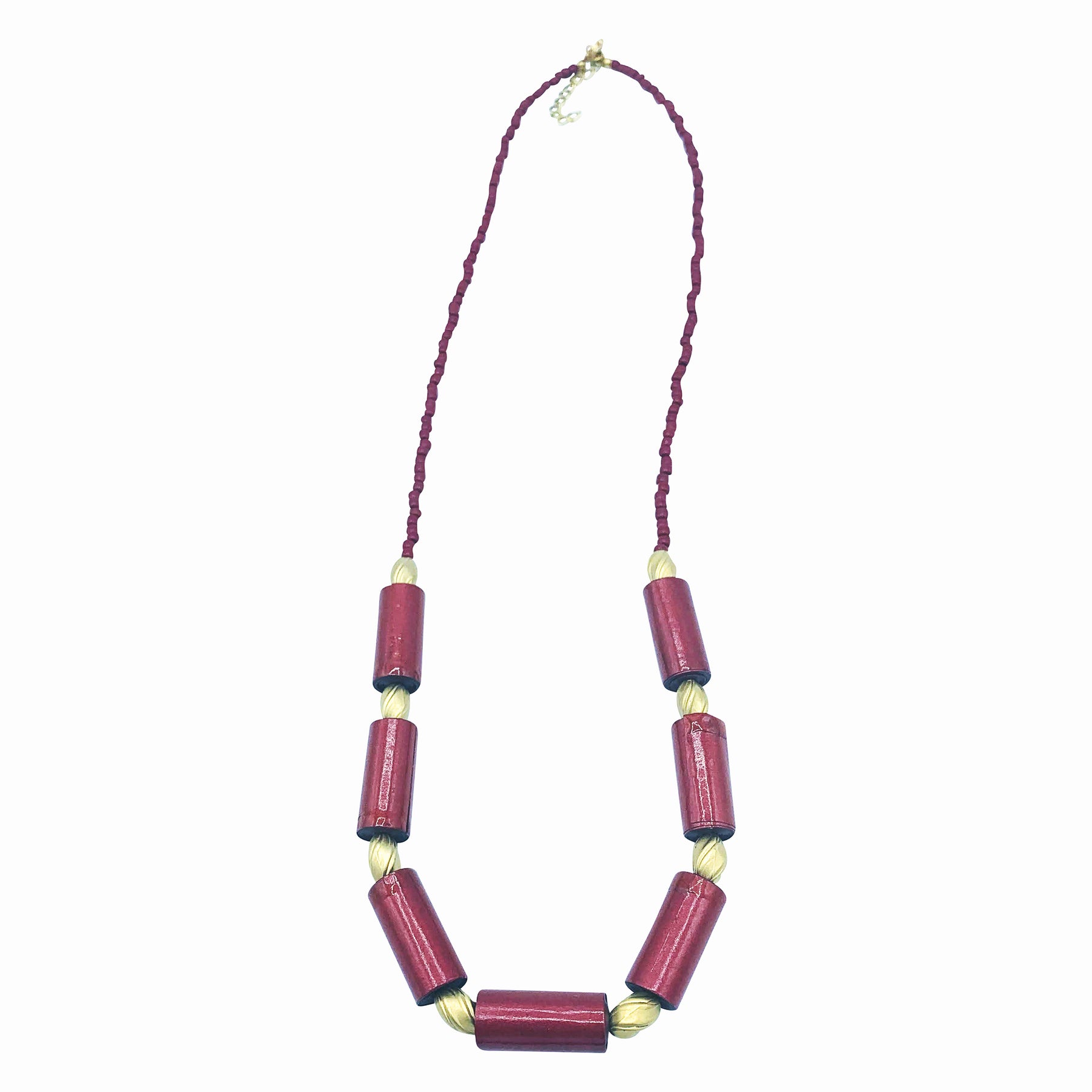Bold and gorgeous necklace in crimson color paper beads, gold hue metal beads and glass beads, clasp and extender. I've created this necklace, by combining different materials and textures. Simply a great jewelry piece to update any outfit and make a statement!