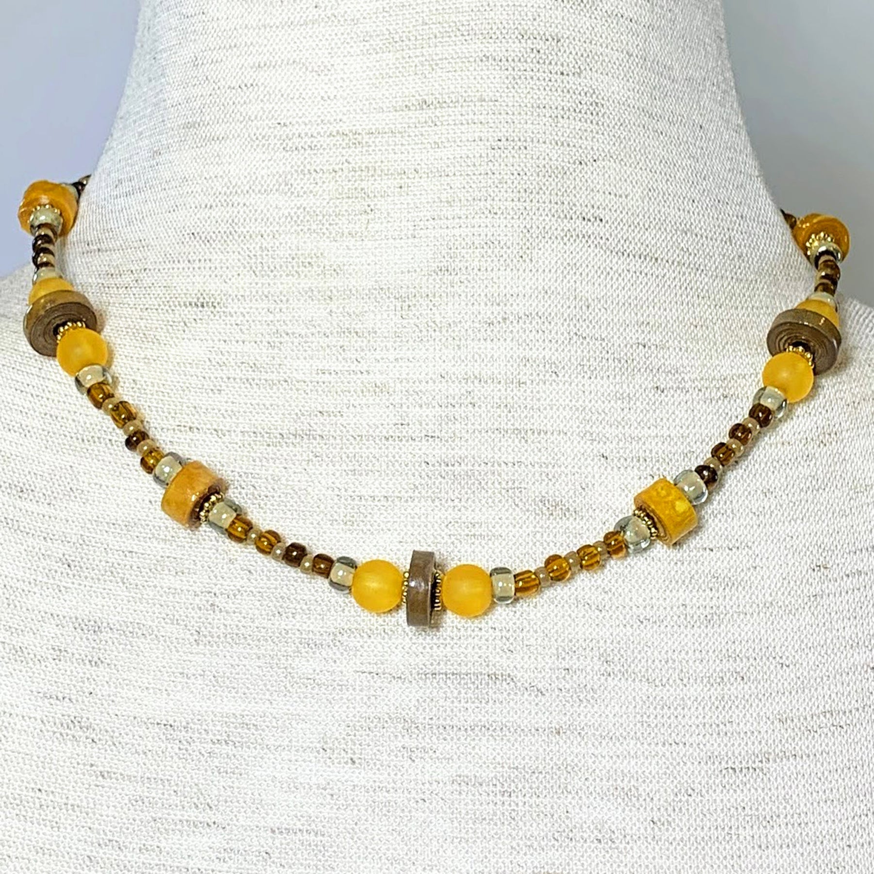 Brown and amber paper beads combined with mixed media beads, clasp and extension.