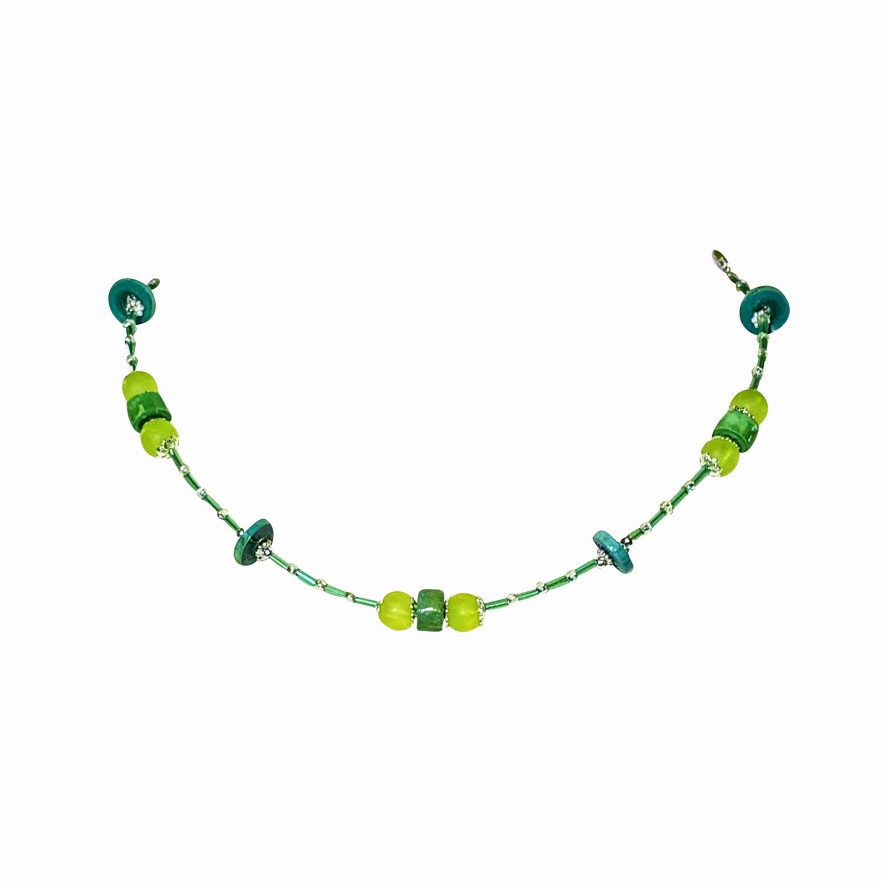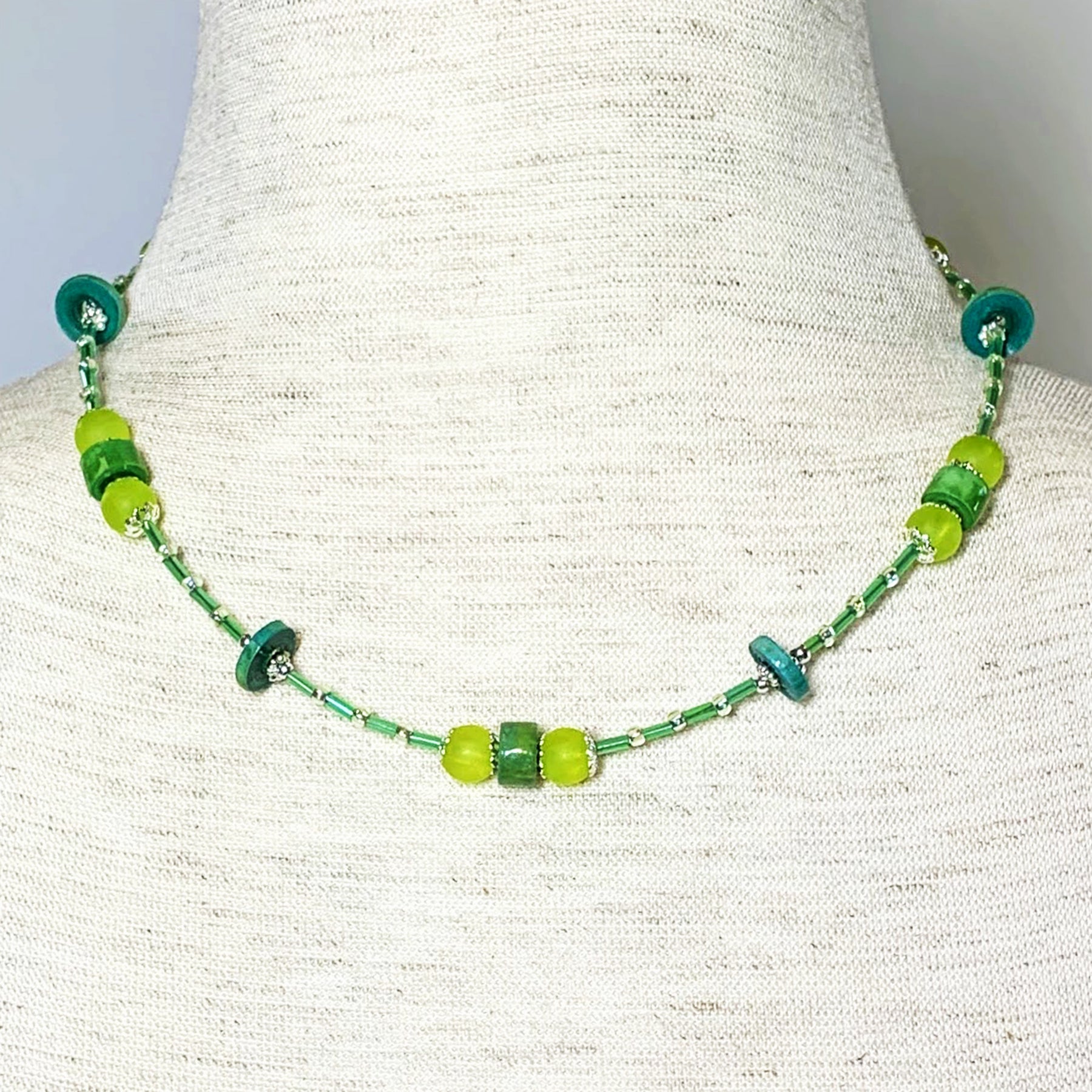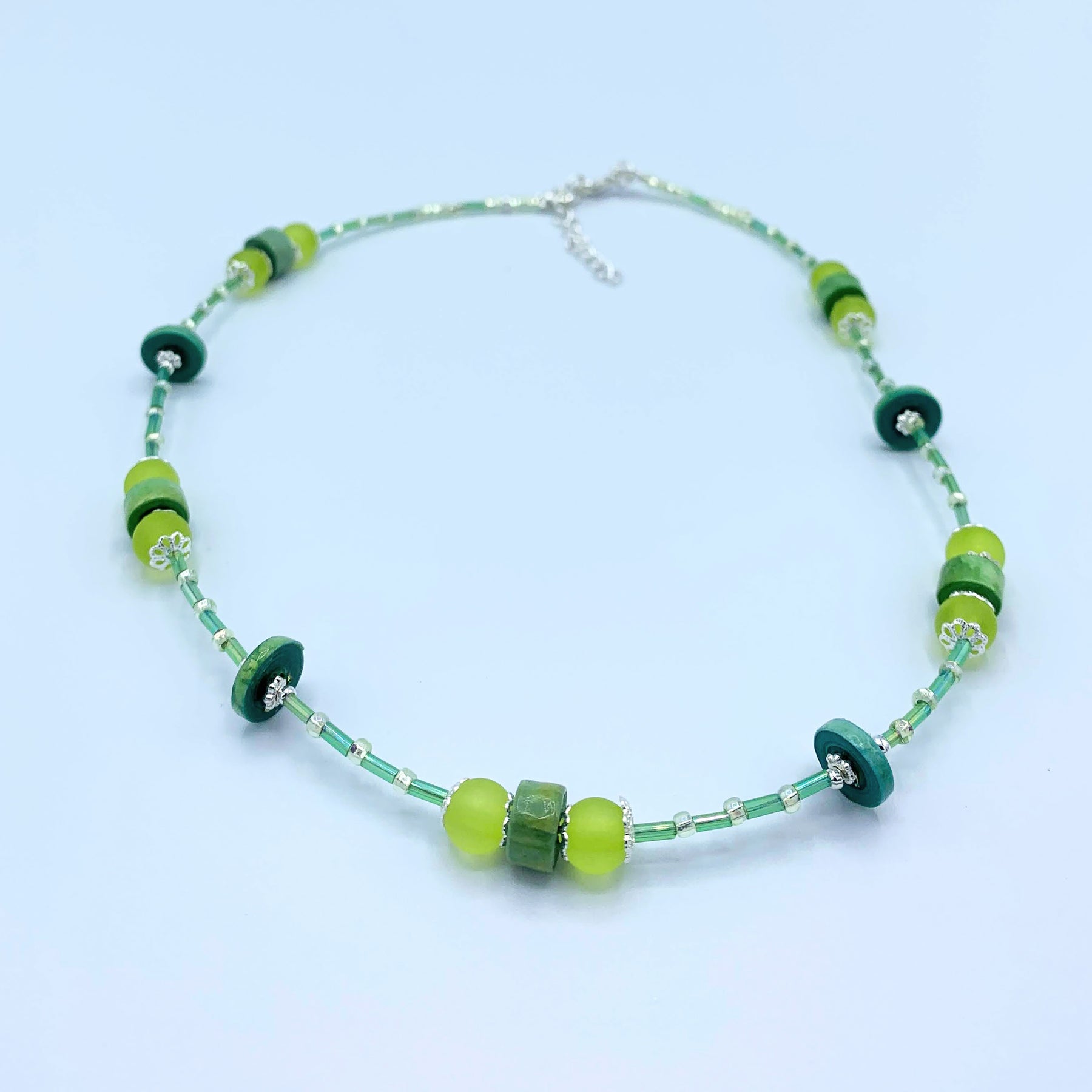 Beautiful Green Necklace made with paper beads and glass beads, a silver clasp w chain extension.