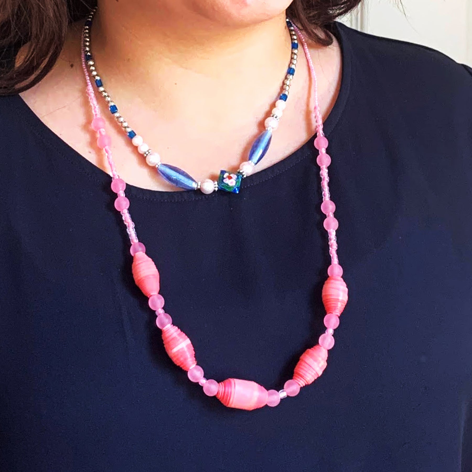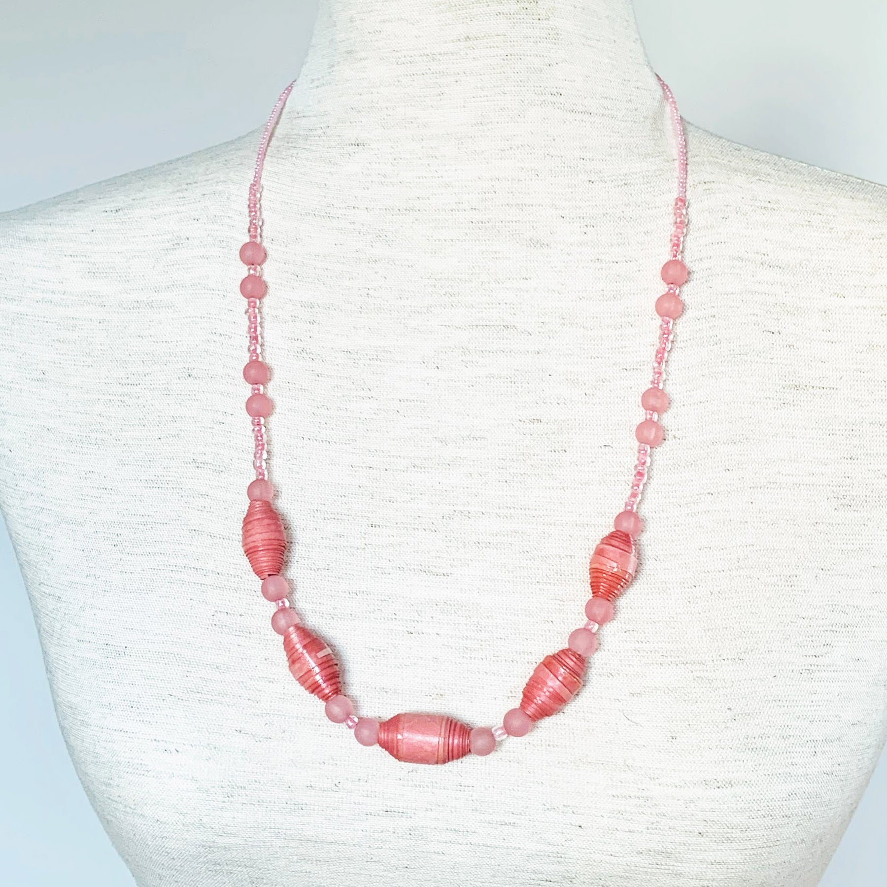 Unique pieces that we love, in an eclectic and versatile selection of styles, this necklace combines hot pink handmade paper beads, resin, and glass beads, a clasp with extender. Unique design for any occasion.
