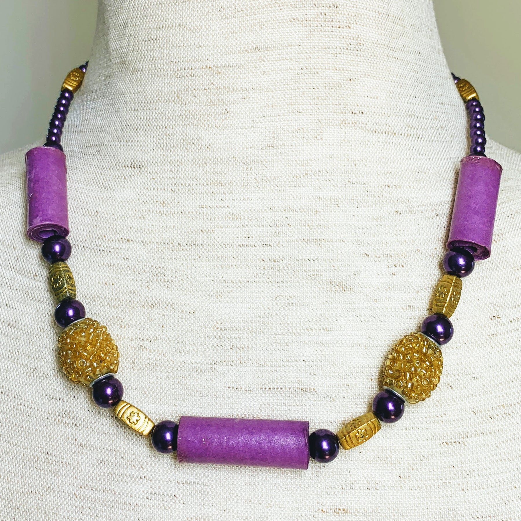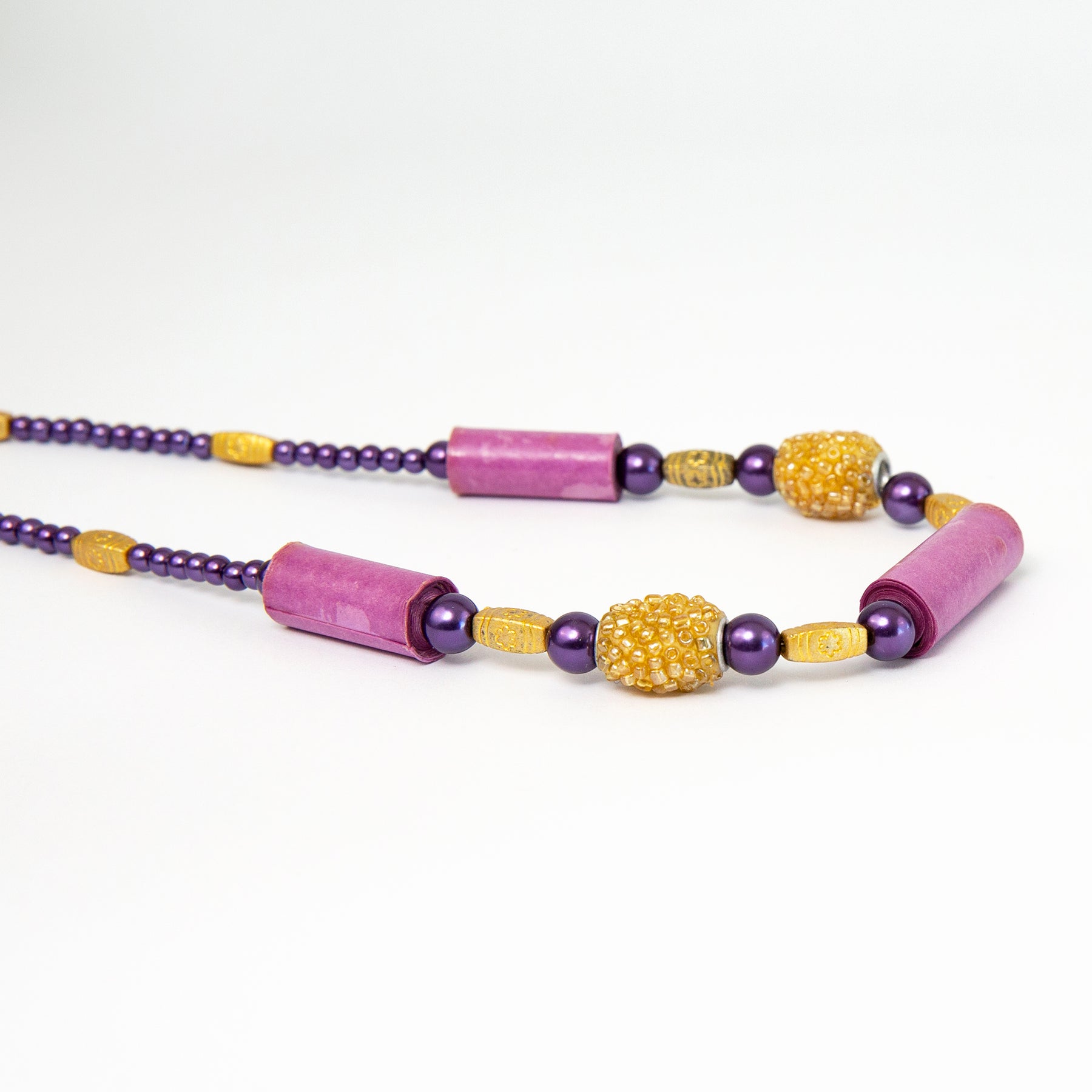 Bright purple paper beads combined with glass pearls, gold tone resin beads, with silver clasp and chain extension.